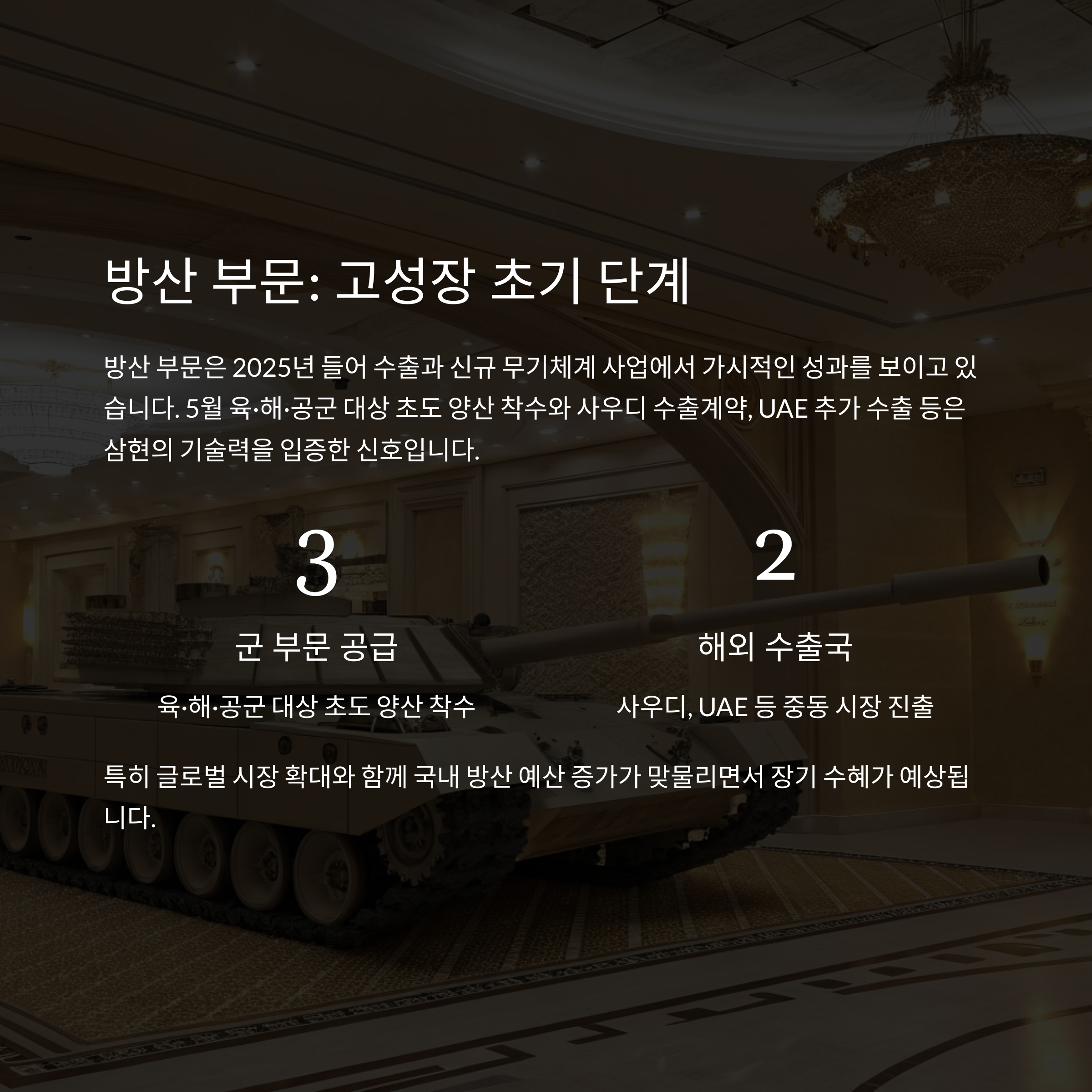 방산 부문은 2025년 들어 수출과 신규 무기체계 사업에서 가시적인 성과를 보이고 있습니다.