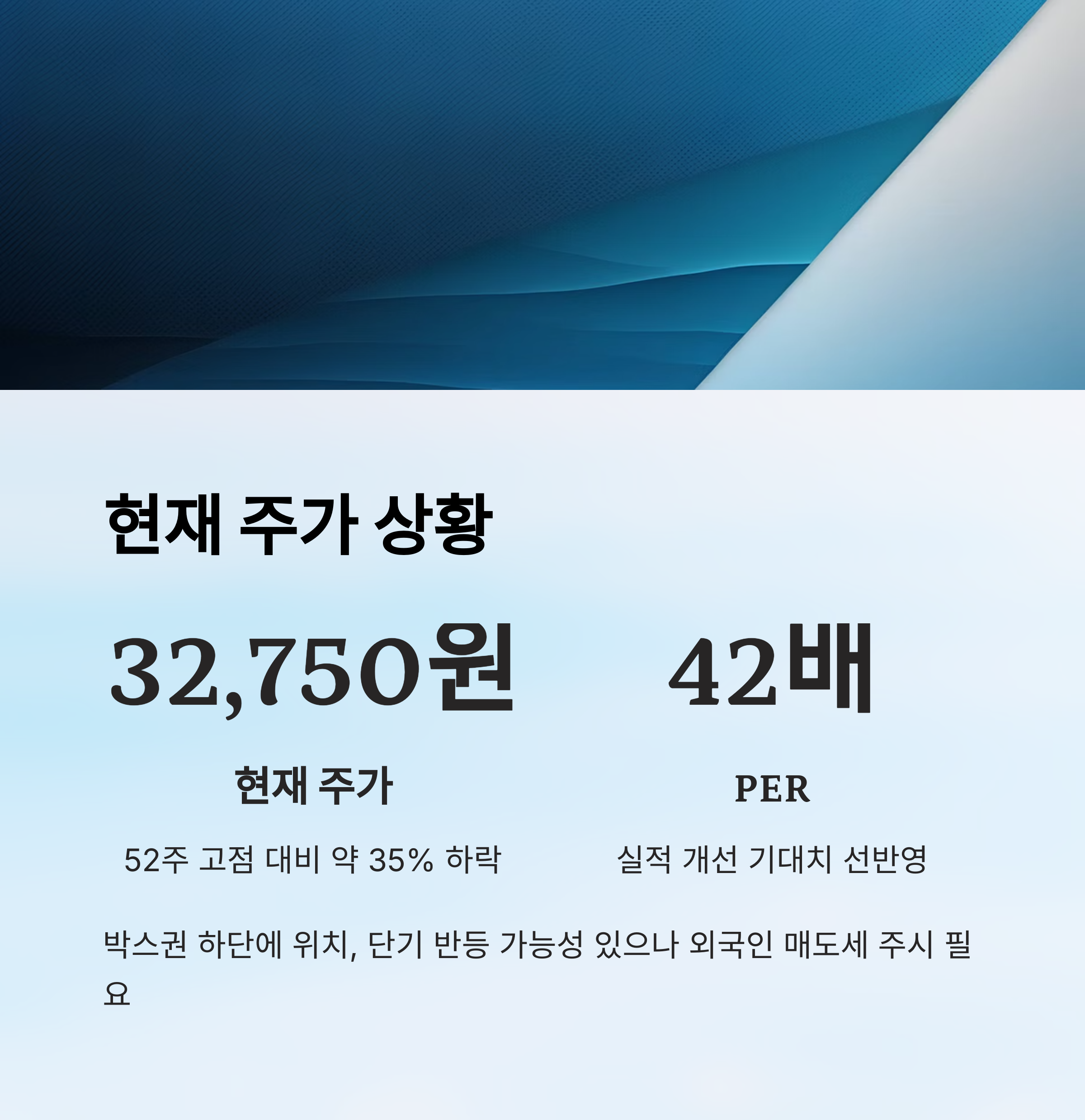 단기 조정을 받은 상태입니다. PER은 약 42~44배 수준으로, 실적 개선 기대치를 선반영한 고평가 구간에 있습니다.