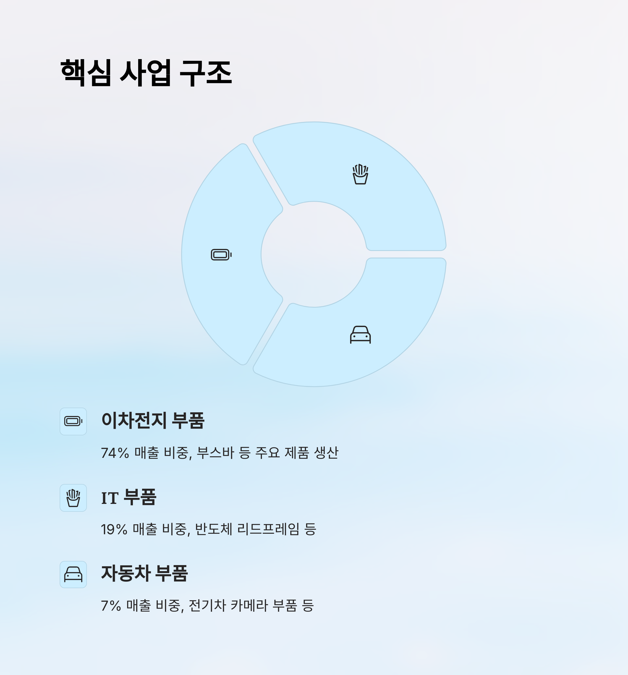 이차전지 부품의 매출 비중이 70% 이상으로 절대적이며, 해당 부문의 기술력과 수주 경쟁력이