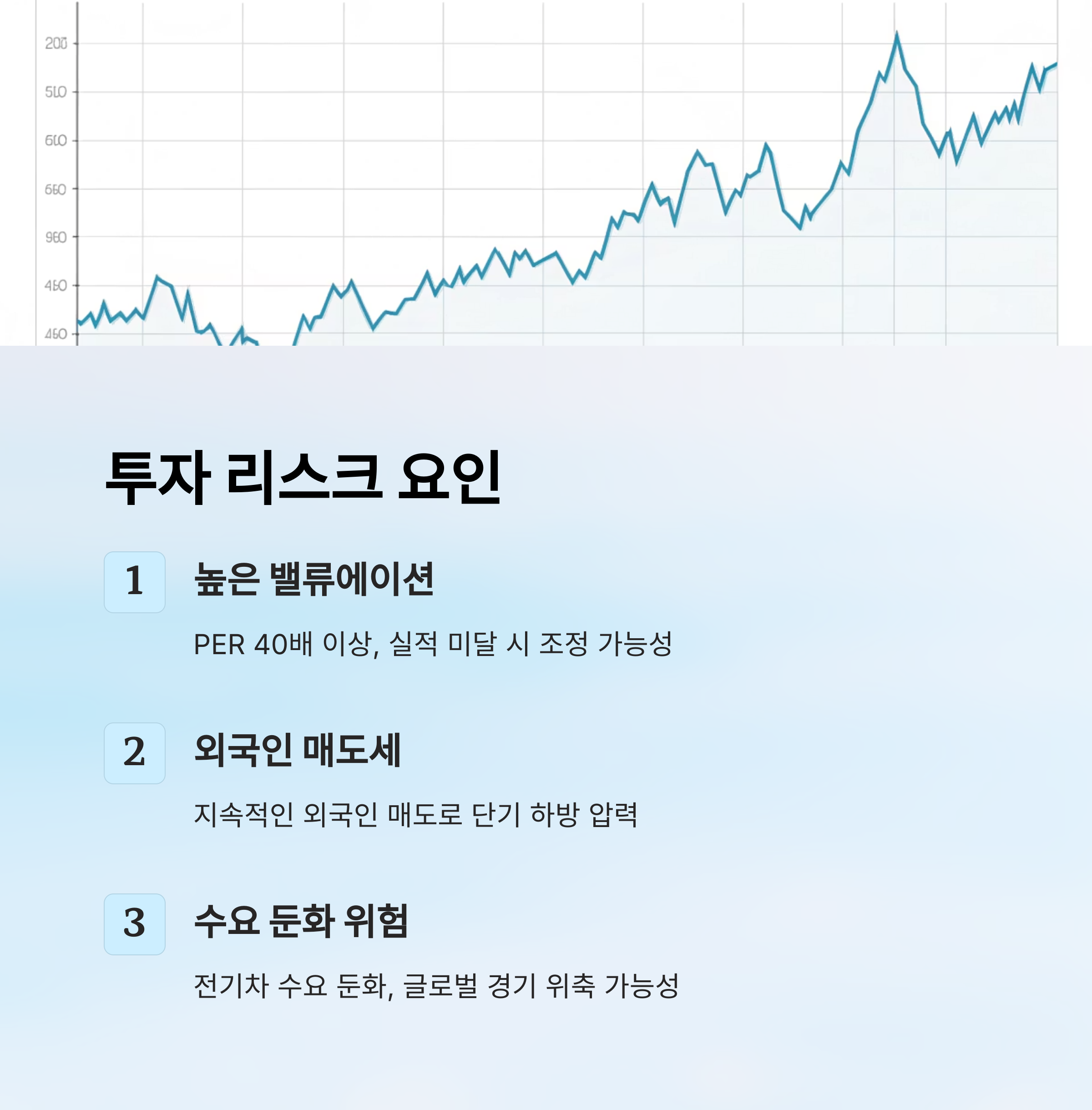 높은 PER(40배 이상)은 실적 기대치를 반영한 수치로, 향후 실적이 이를 충족하지 못할 경우
