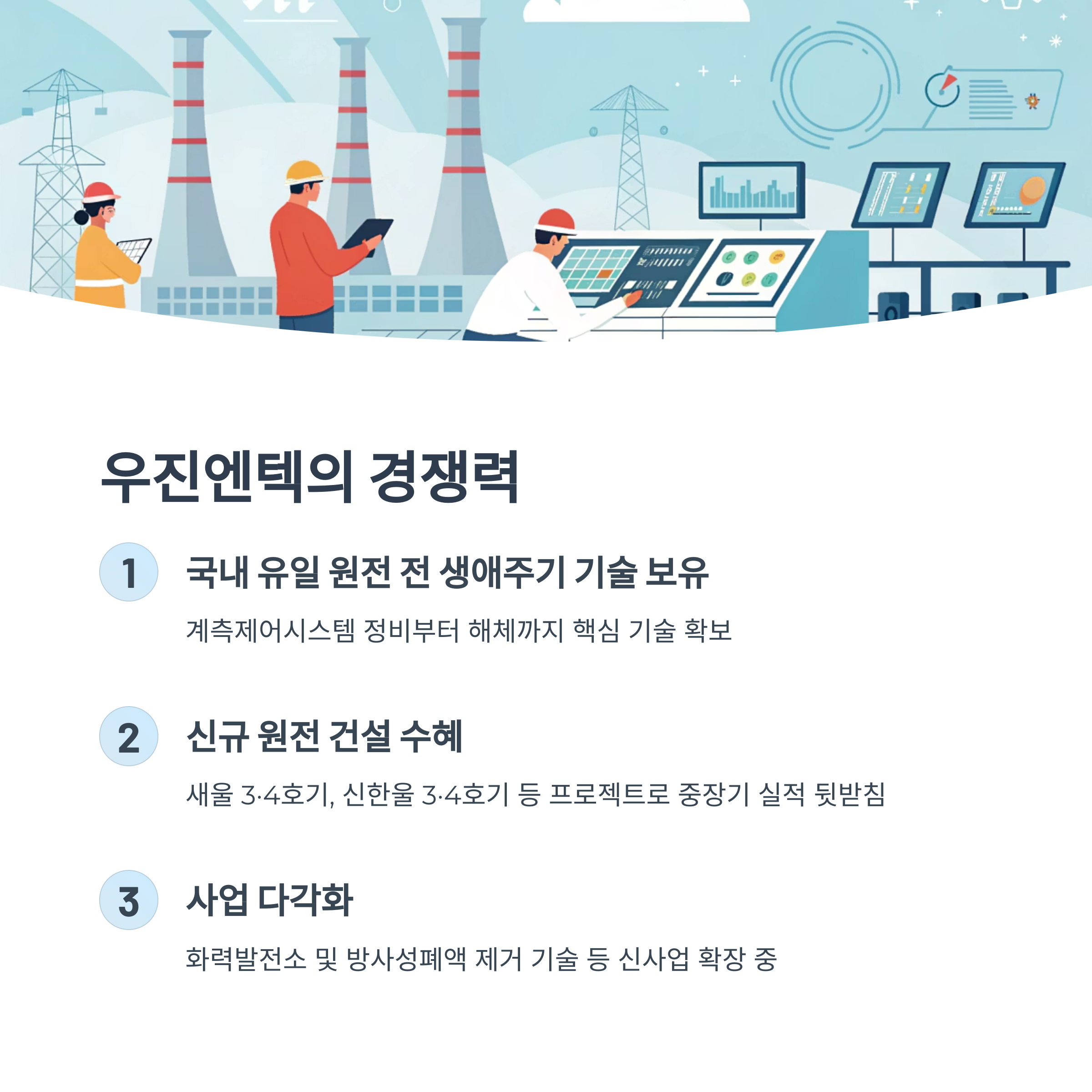 요약하자면, 우진엔텍은 단순한 원전 관련주가 아니라, 정비-운영-해체 전 과정을 아우르는 '전 생애주기 플레이어'입니다.