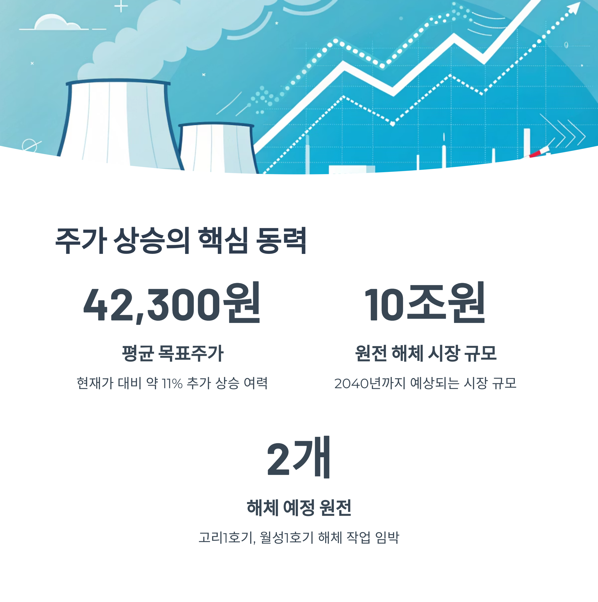 국내외 친원전 기조와 함께 수조 원 규모의 해체 시장 개화, 신규 프로젝트 수주 확대라는 구조적 성장 모멘텀이 주가 상승의 핵심 배경입니다.