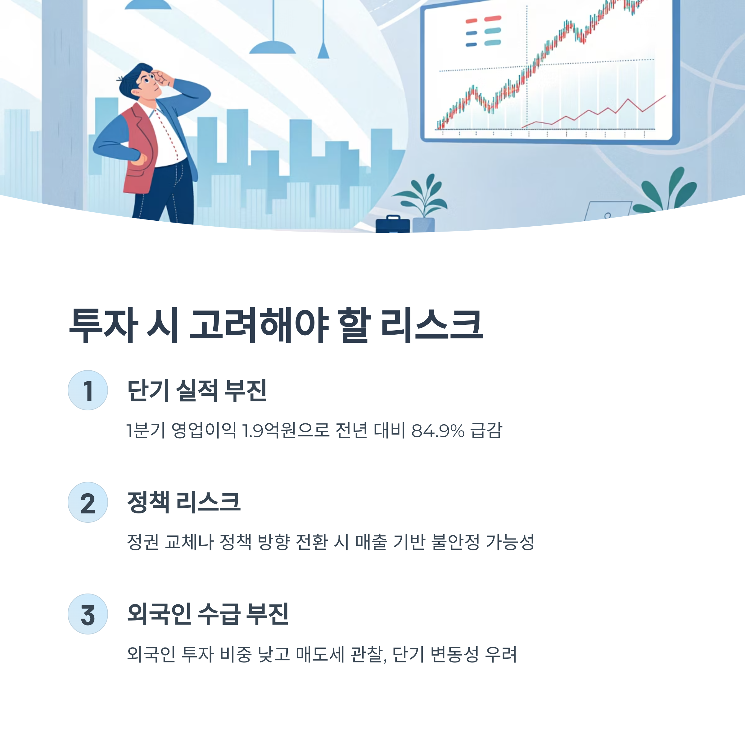 하지만 단기 실적 부진과 정책 리스크, 외국인 수급 등은 매수 타이밍과 투자 비중을 신중하게 판단해야 할 이유이기도 합니다.
