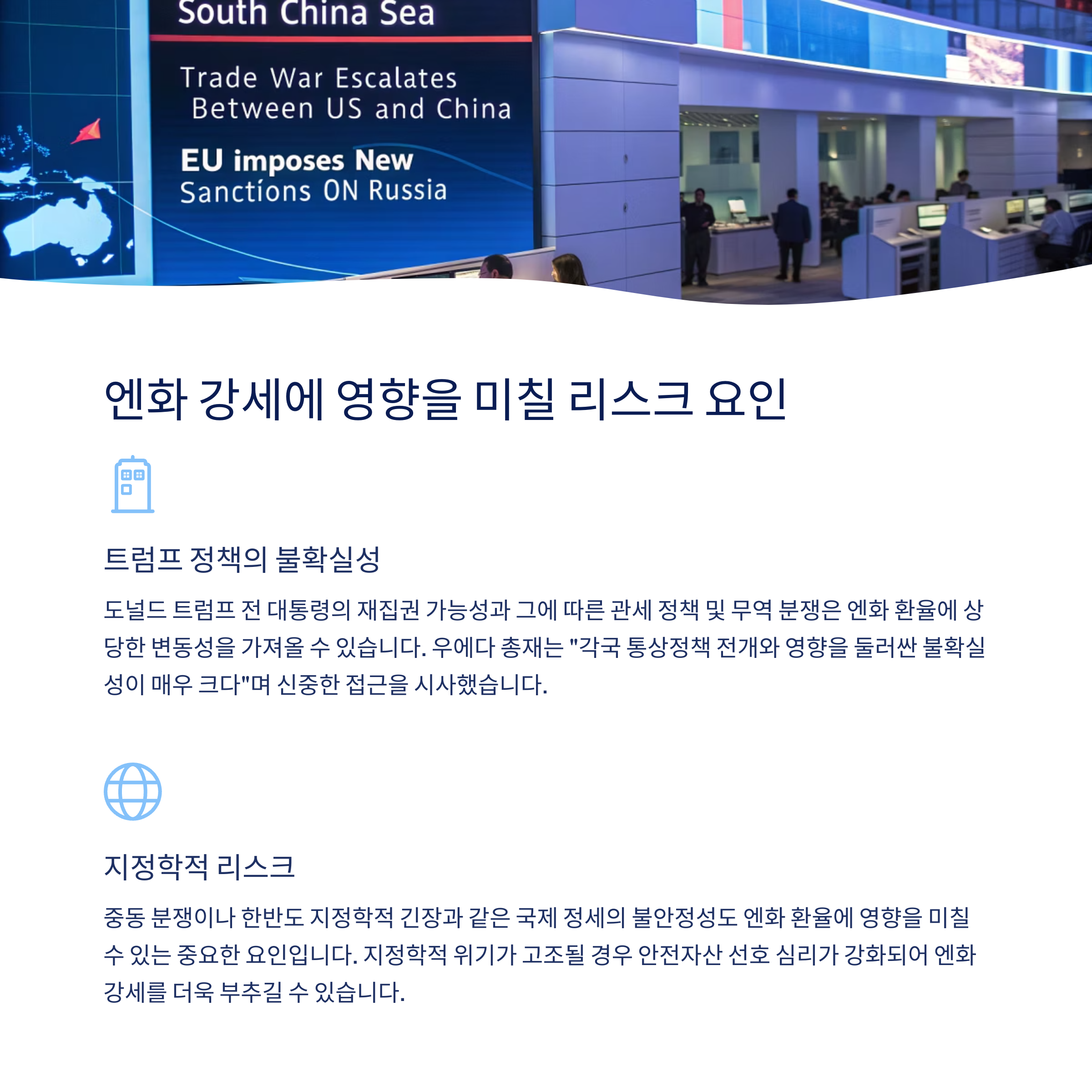 물론 긍정적인 전망만 있는 것은 아닙니다. 엔화 강세 기조에 영향을 미칠 수 있는 몇 가지 리스크 요인들도 존재합니다.