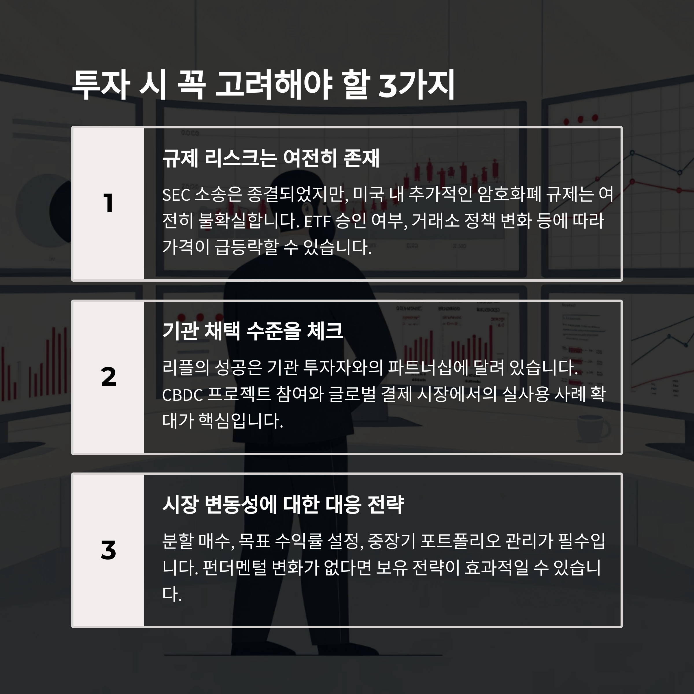 SEC 소송은 종결되었지만, 미국 내 추가적인 암호화폐 규제는 여전히 불확실합니다. 특히 ETF 승인 여부, 거래소 정책 변화 등에 따라 가격이 급등락할 수 있으므로, 리플 전망만을 믿고 올인하는 전략은 위험할 수 있습니다.