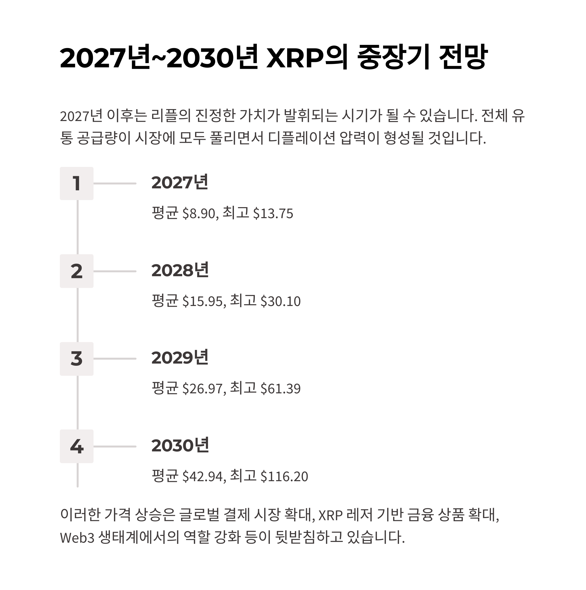 특히 2030년의 최고 $116.20라는 수치는, 리플이 단순한 암호화폐가 아니라 글로벌 금융 인프라의 핵심 유틸리티 자산으로 자리 잡을 수 있음을 시사합니다.