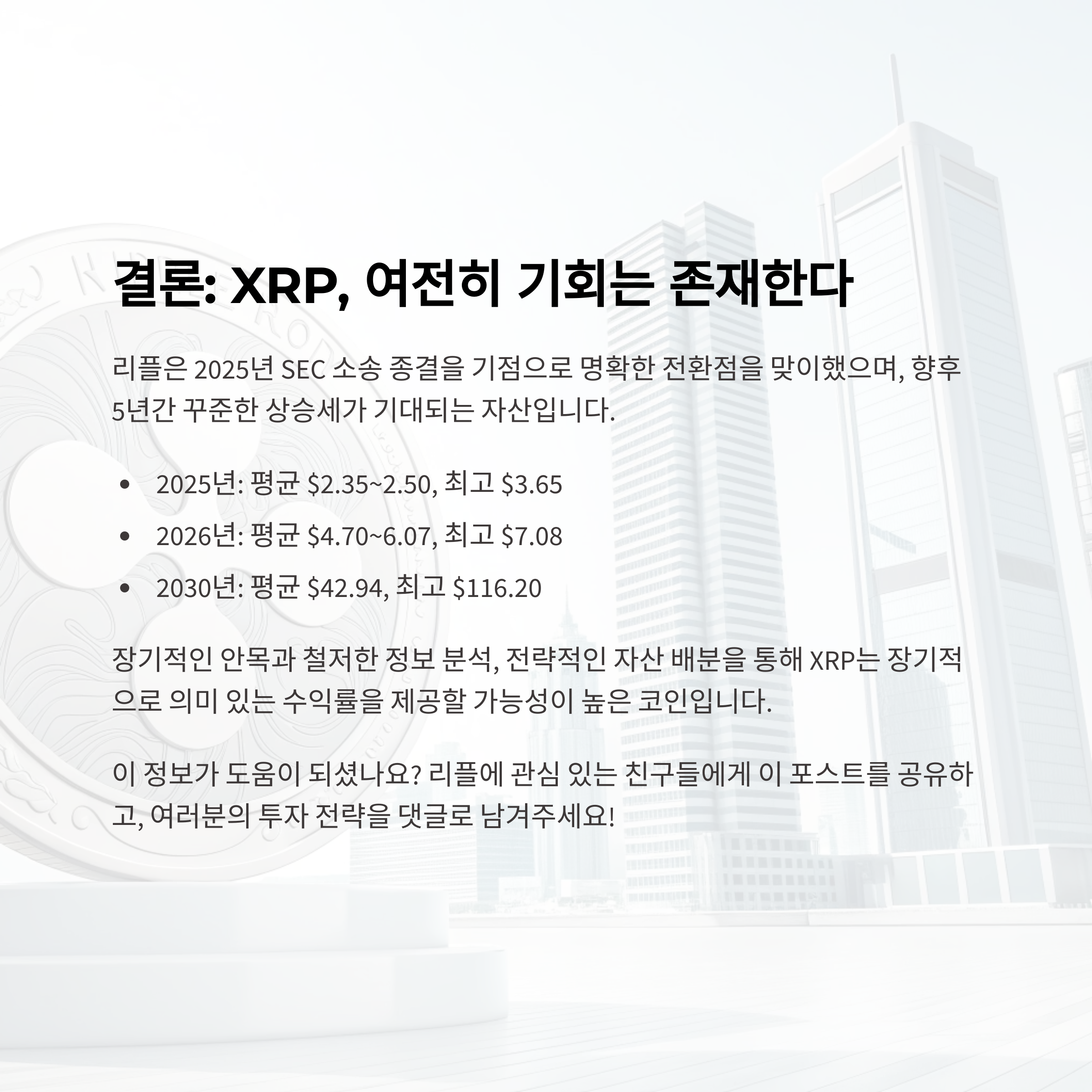 지금까지의 분석을 종합해보면, 리플은 2025년 SEC 소송 종결을 기점으로 명확한 전환점을 맞이했으며, 향후 5년 간 꾸준한 상승세가 기대되는 자산입니다.