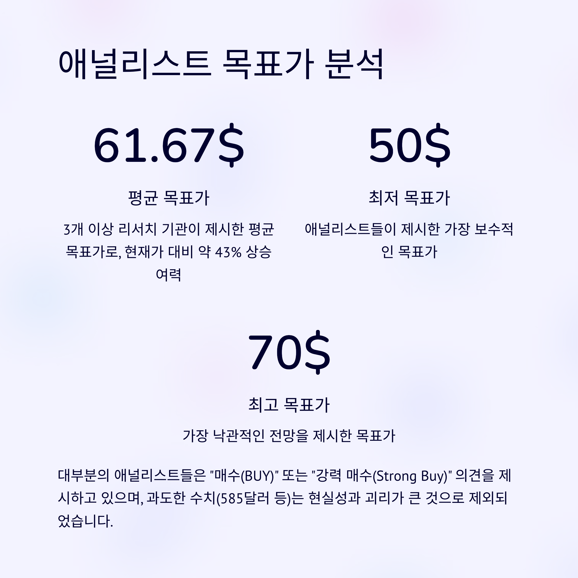 3개 이상 리서치 기관이 제시한 평균 목표가는 61.67달러로 집계되며, 최저치는 50달러, 최고치는 70달러 수준입니다. 과도한 수치(585달러 등)는 현실성과 괴리가 큰 것으로 제외되며, 대부분 “매수(BUY)” 또는 “강력 매수(Strong Buy)” 의견이 우세합니다.