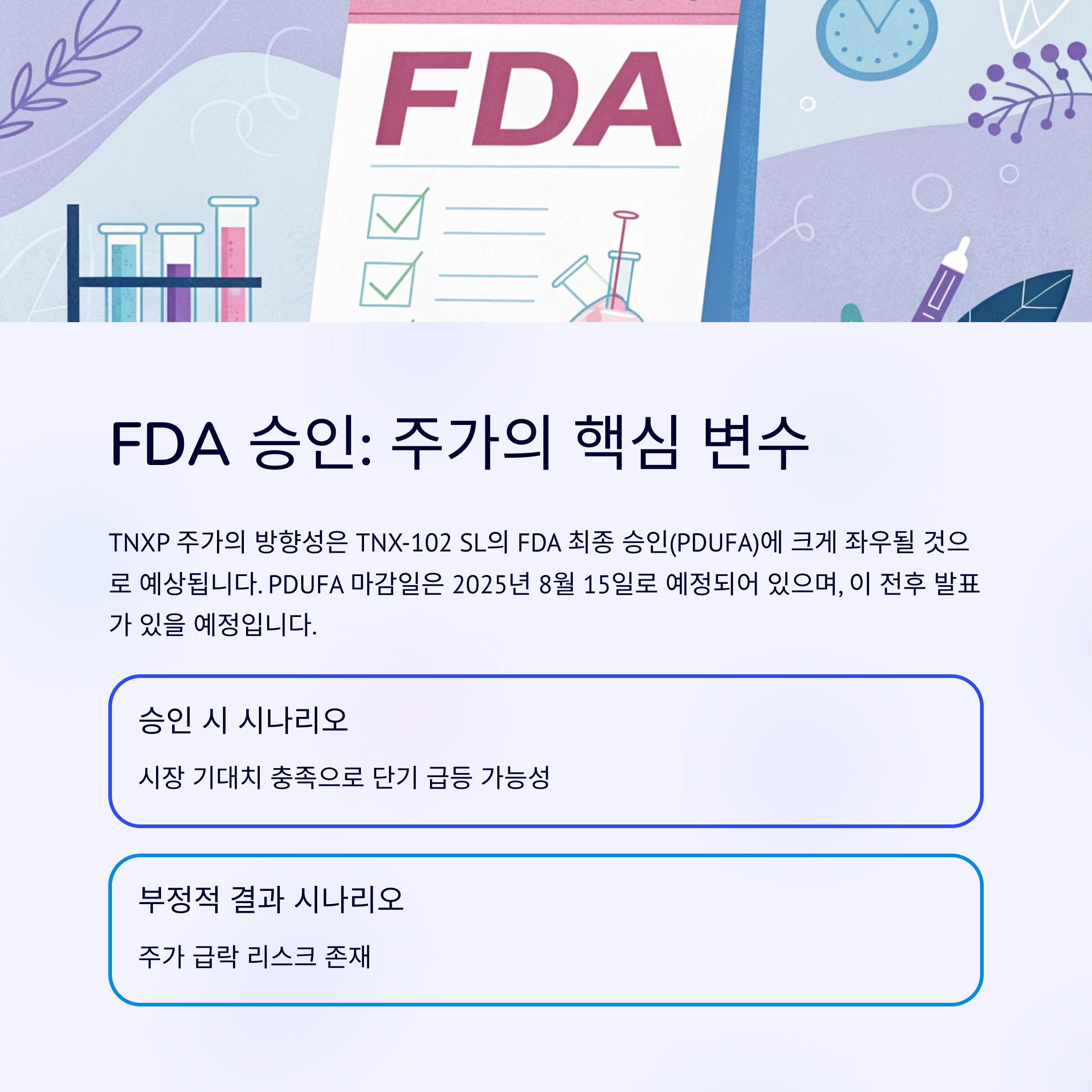 주가 방향성은 TNX-102 SL의 FDA 최종 승인(PDUFA)에 좌우될 가능성이 큽니다. PDUFA 마감일은 2025년 8월 15일로, 이 전후 발표가 있을 예정이며, 승인 시 시장 기대치는 단기 급등으로 이어질 수 있습니다. 반대로 부정적 결과 시 주가는 급락 리스크도 존재합니다.