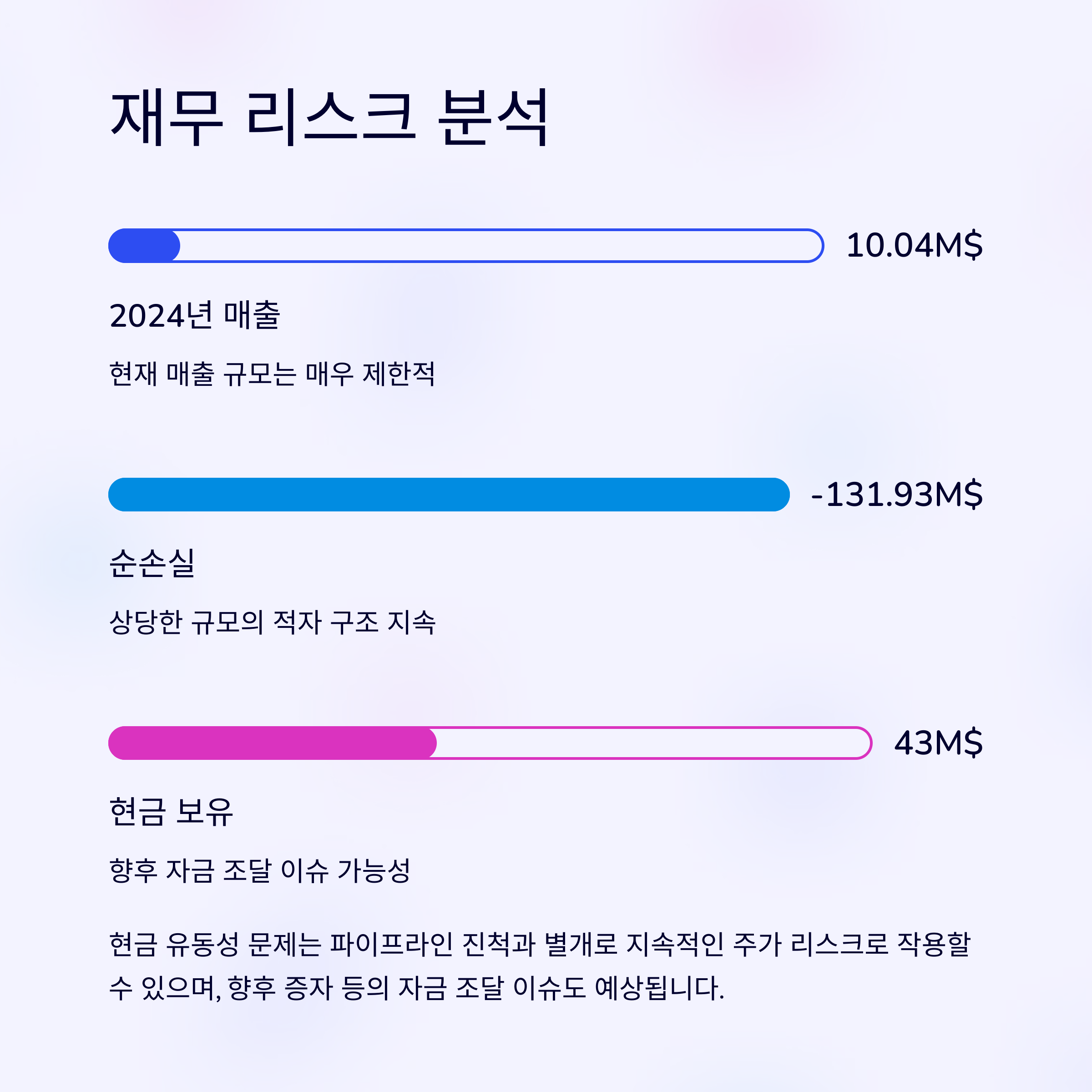 2024년 기준 매출은 약 1천만 달러 수준에 불과하고, 순손실은 약 1억 3천만 달러를 넘습니다. 현금 유동성 문제는 파이프라인 진척과 별개로 지속적인 주가 리스크로 작용할 수 있으며, 향후 자금 조달 이슈(증자 등)도 예고될 수 있습니다.