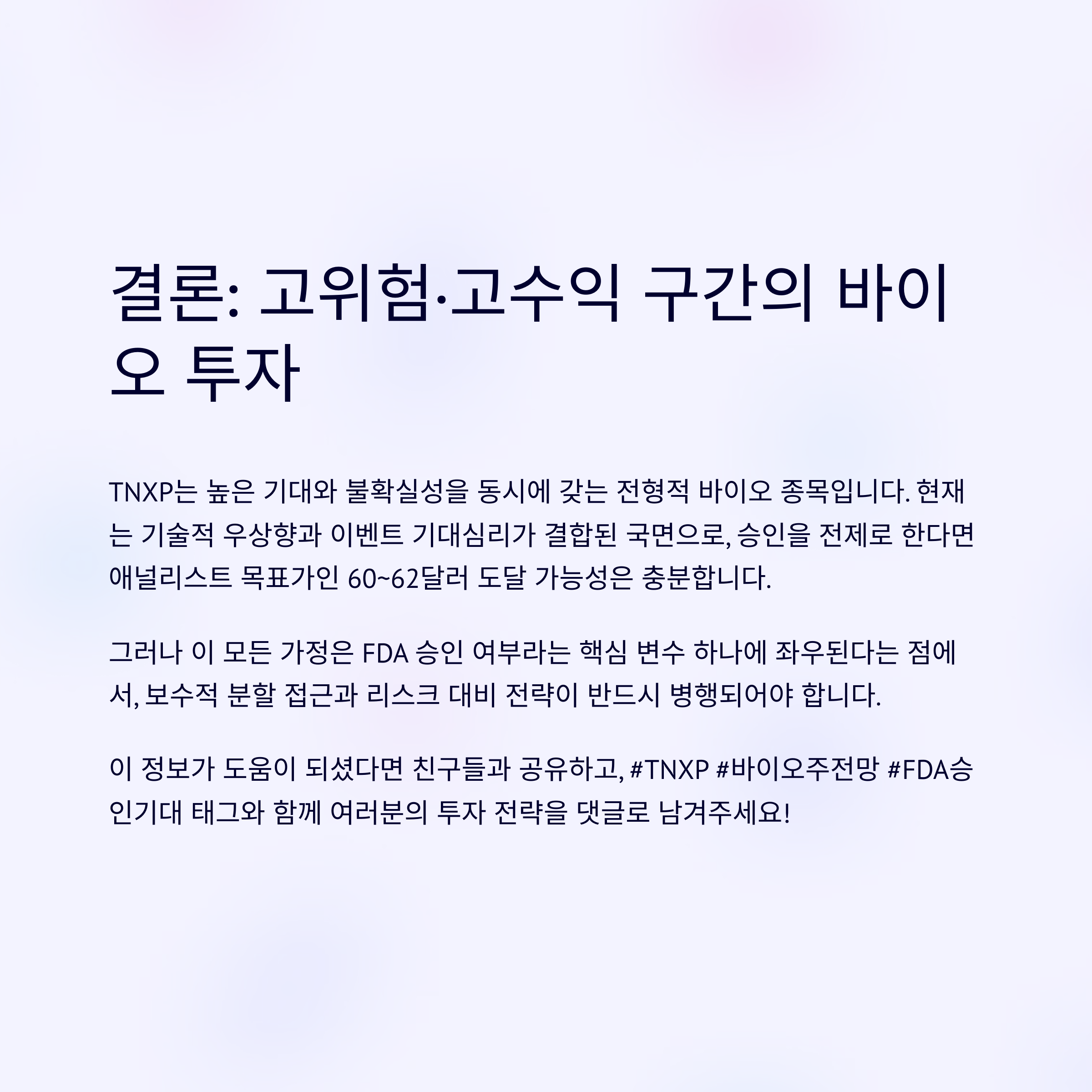 TNXP는 높은 기대와 불확실성을 동시에 갖는 전형적 바이오 종목입니다. 현재는 기술적 우상향과 이벤트 기대심리가 결합된 국면으로, 승인을 전제로 한다면 애널리스트 목표가인 60~62달러 도달 가능성은 충분합니다. 그러나 이 모든 가정은 FDA 승인 여부라는 핵심 변수 하나에 좌우된다는 점에서, 보수적 분할 접근과 리스크 대비 전략이 반드시 병행되어야 합니다.