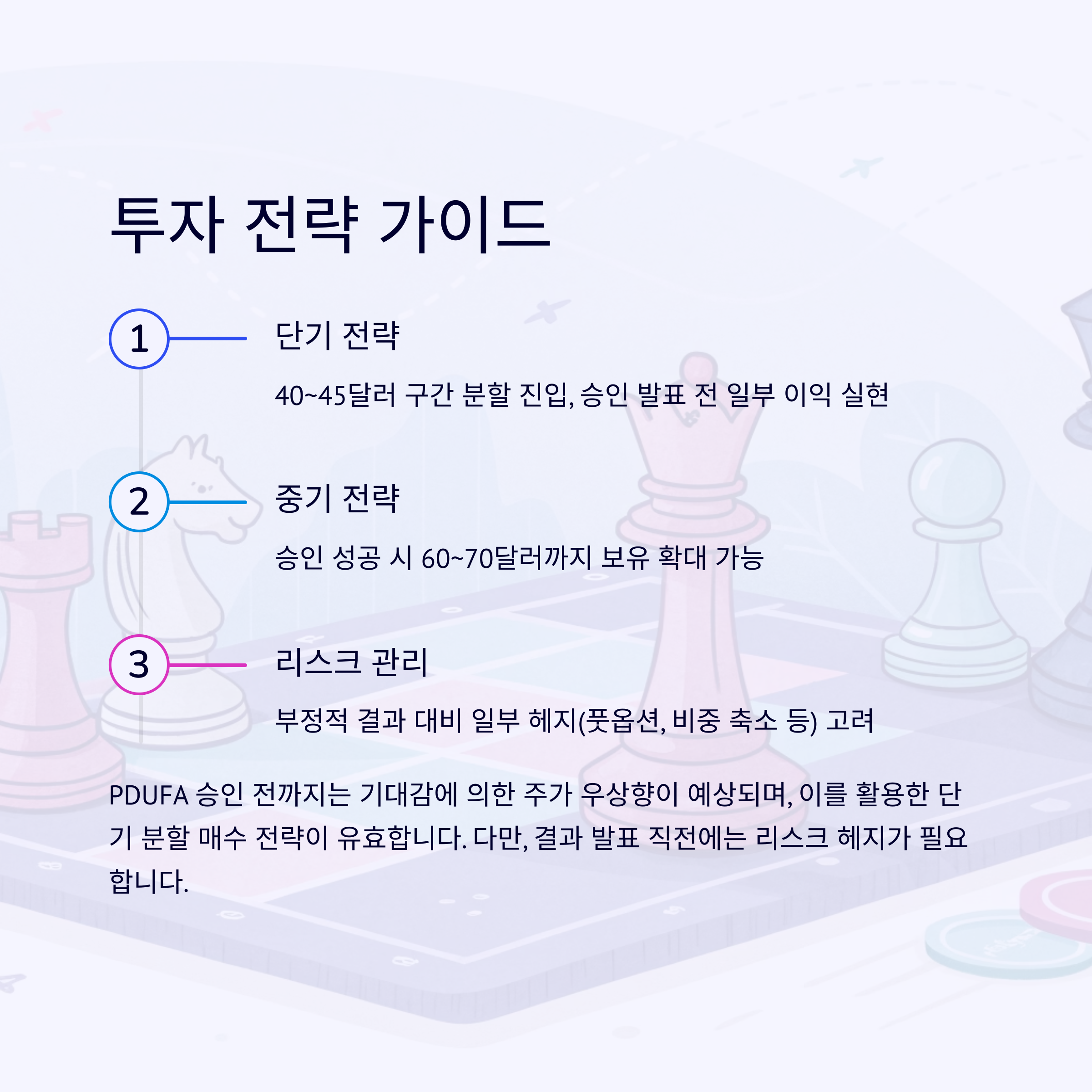 | 단기 전략 | 40~45달러 구간 분할 진입, 승인 발표 전 일부 이익 실현 |