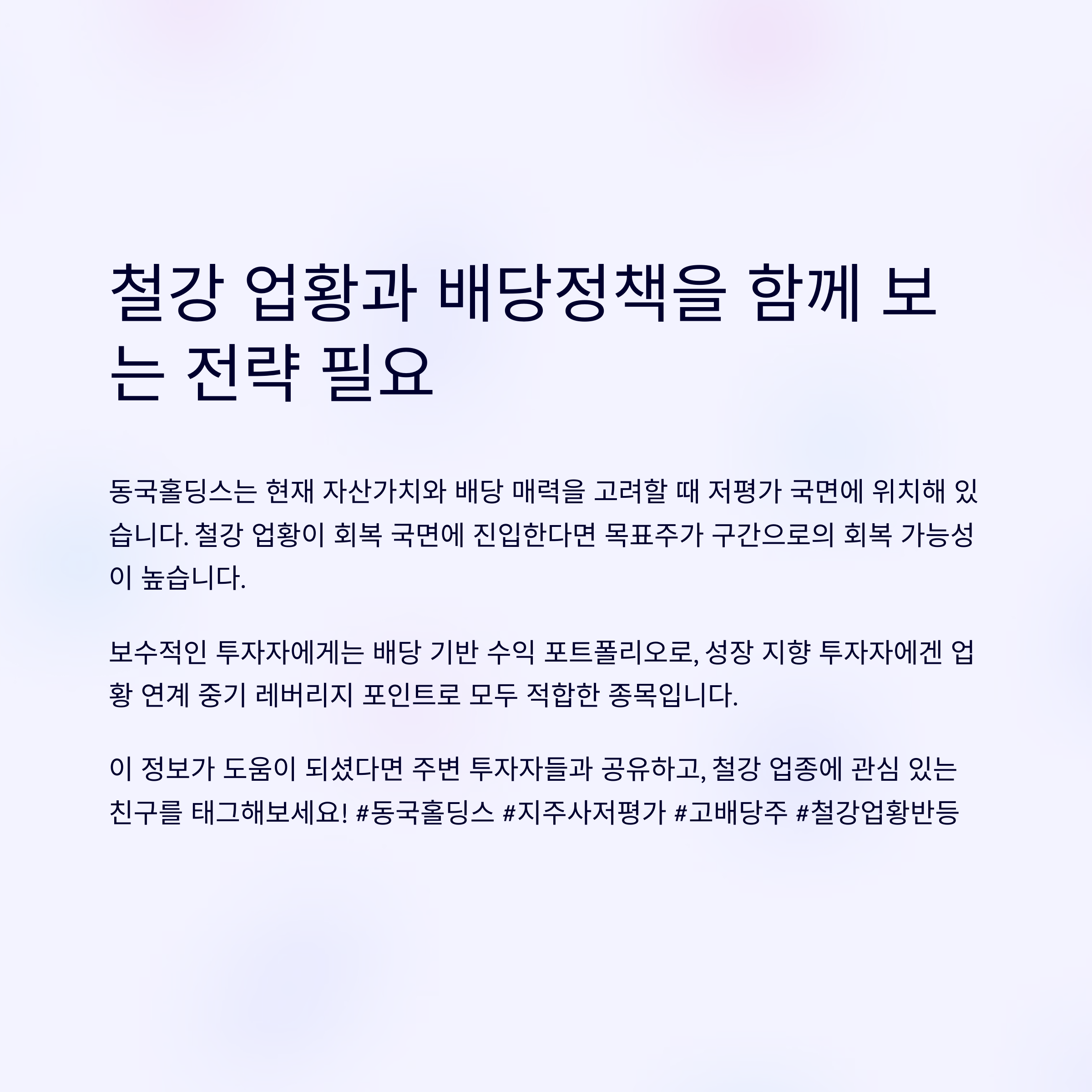 동국홀딩스는 현재 자산가치와 배당 매력을 고려할 때 저평가 국면에 위치해 있으며, 철강 업황이 회복 국면에 진입한다면 목표주가 구간으로의 회복 가능성도 높습니다. 보수적인 투자자에게는 배당 기반 수익 포트폴리오로, 성장 지향 투자자에겐 업황 연계 중기 레버리지 포인트로 모두 적합한 종목입니다.