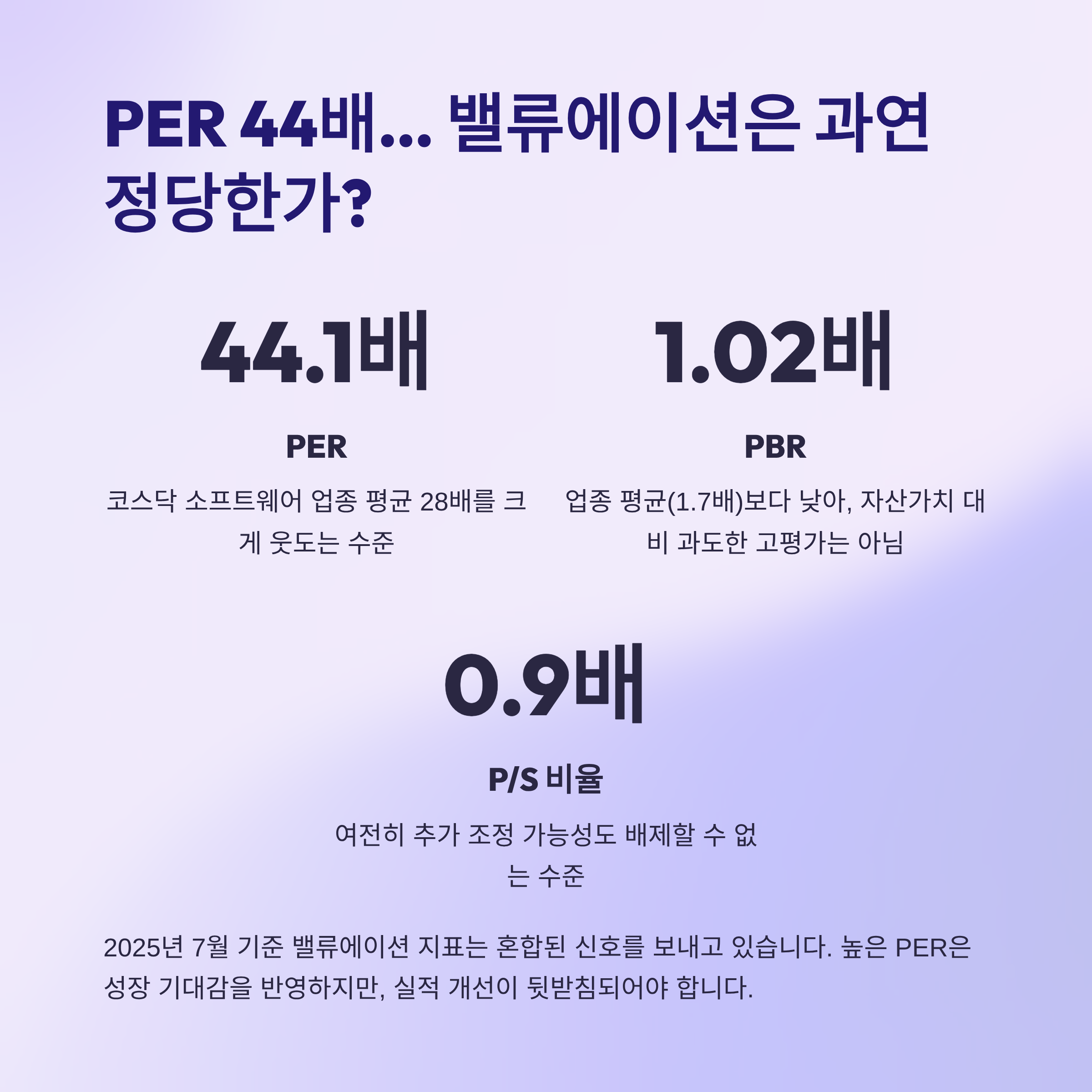 2025년 7월 기준 PER는 약 44.1배로, 코스닥 소프트웨어 업종 평균 28배를 크게 웃돕니다.