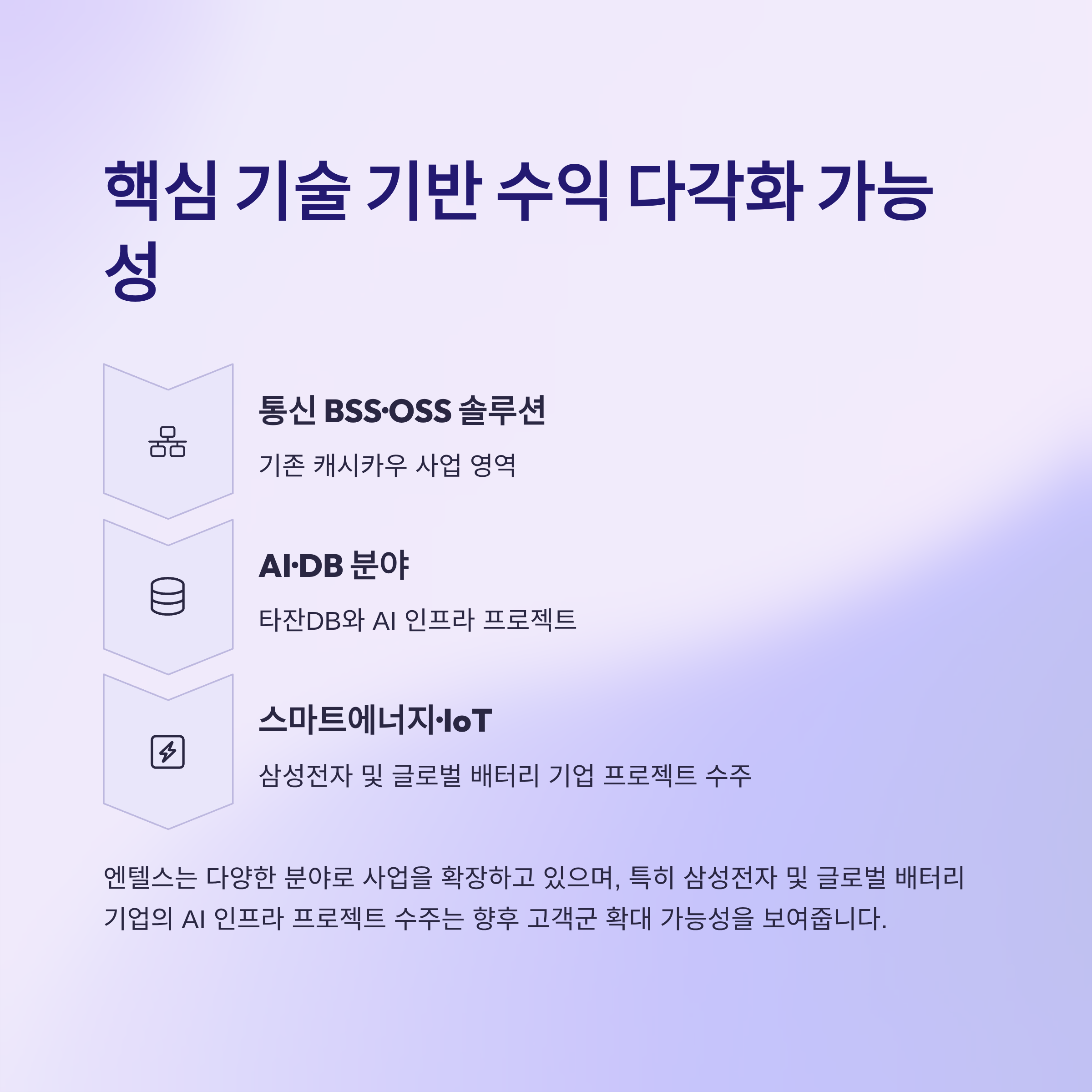 엔텔스는 통신 BSS·OSS 솔루션을 넘어, 스마트에너지·IoT·AI·DB 분야로 수익 기반을 다변화하고 있습니다.