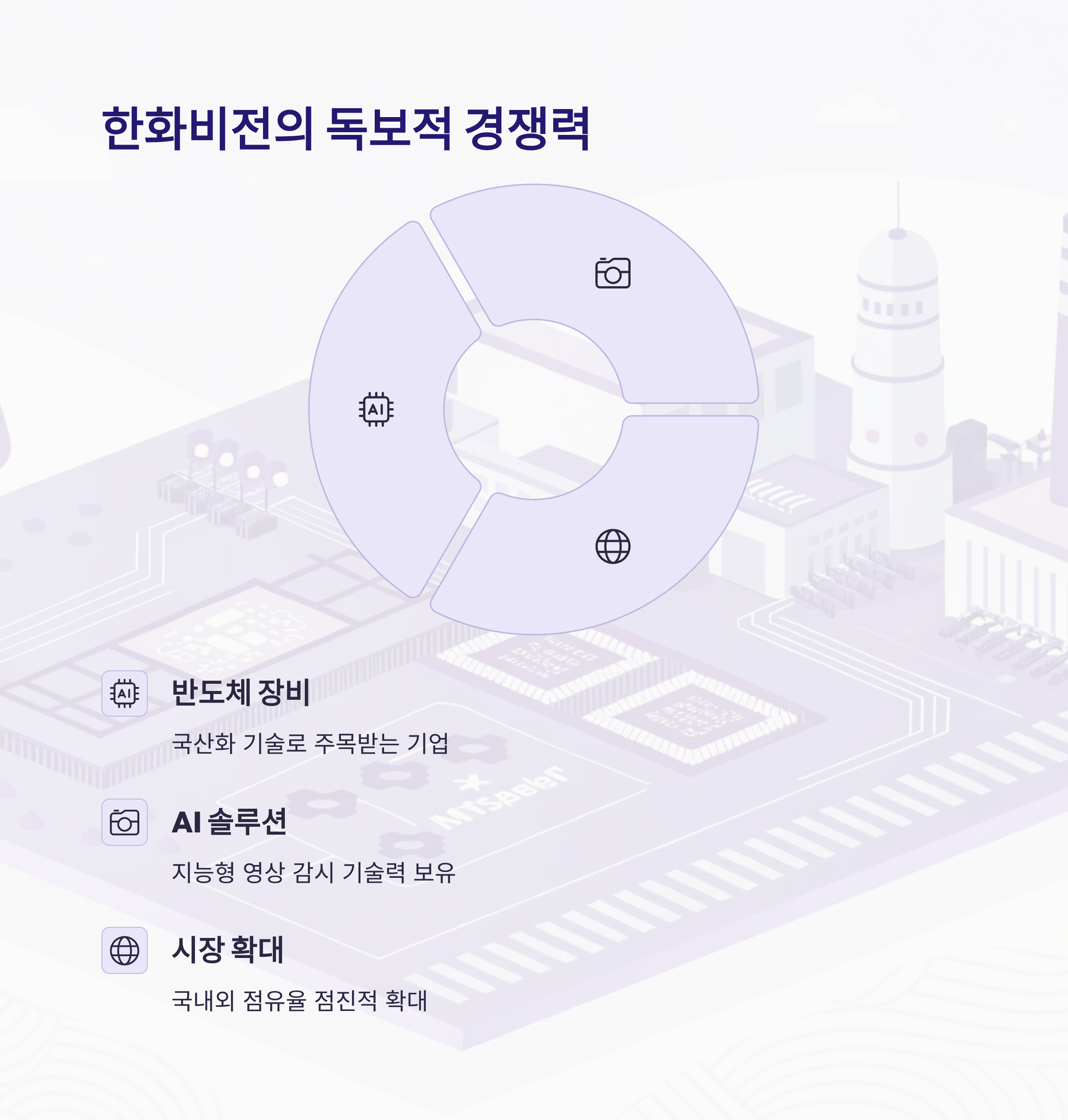 특히, 한화비전의 강점은 자체 SoC(System on Chip) 설계 기술과 광학 설계 기술입니다. 이는 영상 품질과 분석 정확도, 그리고 보안성을 좌우하는 핵심 기술로, 글로벌 경쟁사들과의 차별화 요소로 작용하고 있습니다. 현재 한화비전은 한국 시장 점유율 1위를 차지하고 있으며, 글로벌 시장에서도 중국을 제외하면 5위권 내에 드는 경쟁력을 보이고 있습니다.