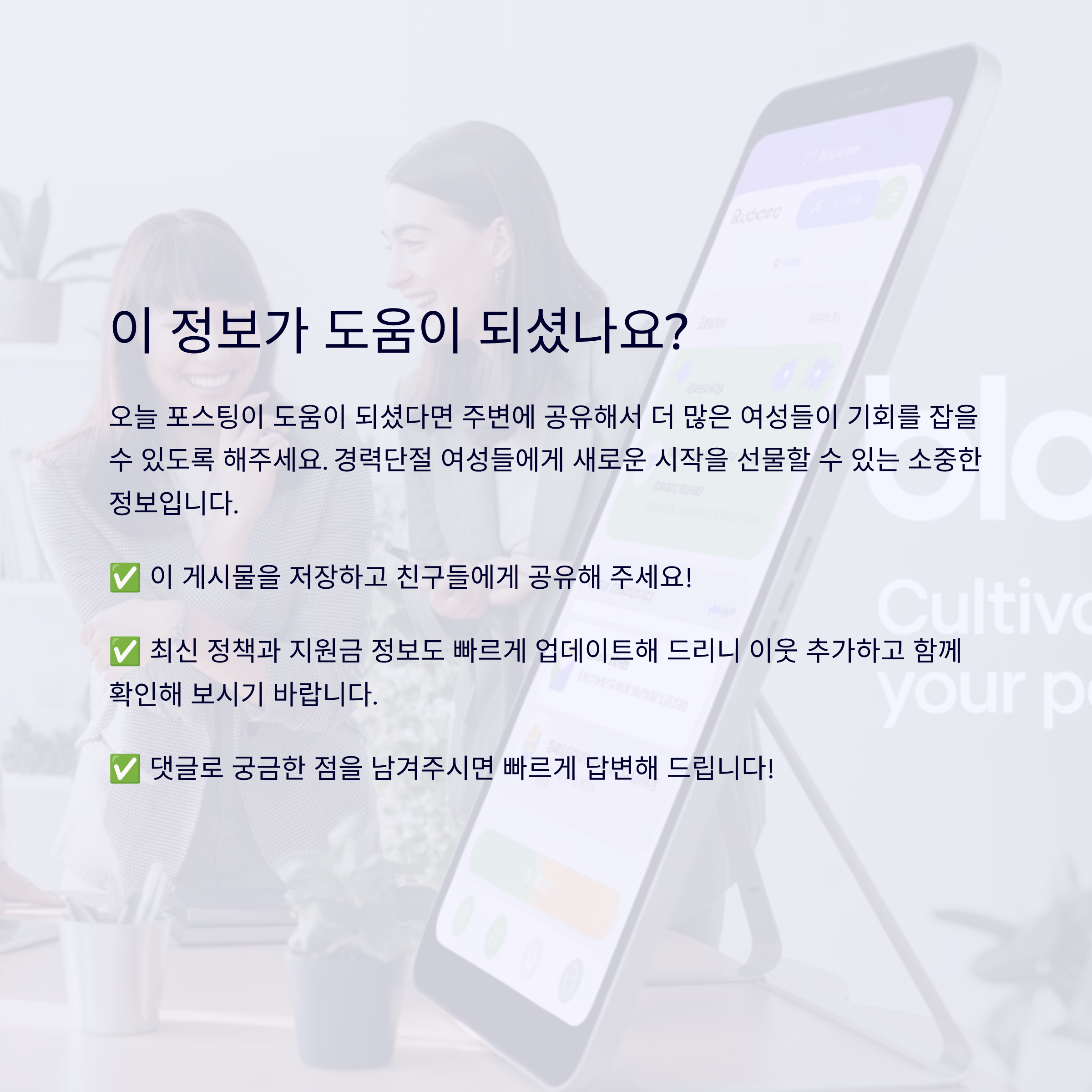 2025년 서울우먼업 구직지원금은 경력단절 여성, 미취업 여성을 위한 마지막 기회입니다. 단순히 최대 90만 원 지원금을 받는 것에서 끝나지 않고, 취업 성공금, 맞춤형 상담, 직업훈련, 취업 연계 서비스까지 제공되어 실질적인 재취업 발판을 마련할 수 있습니다.