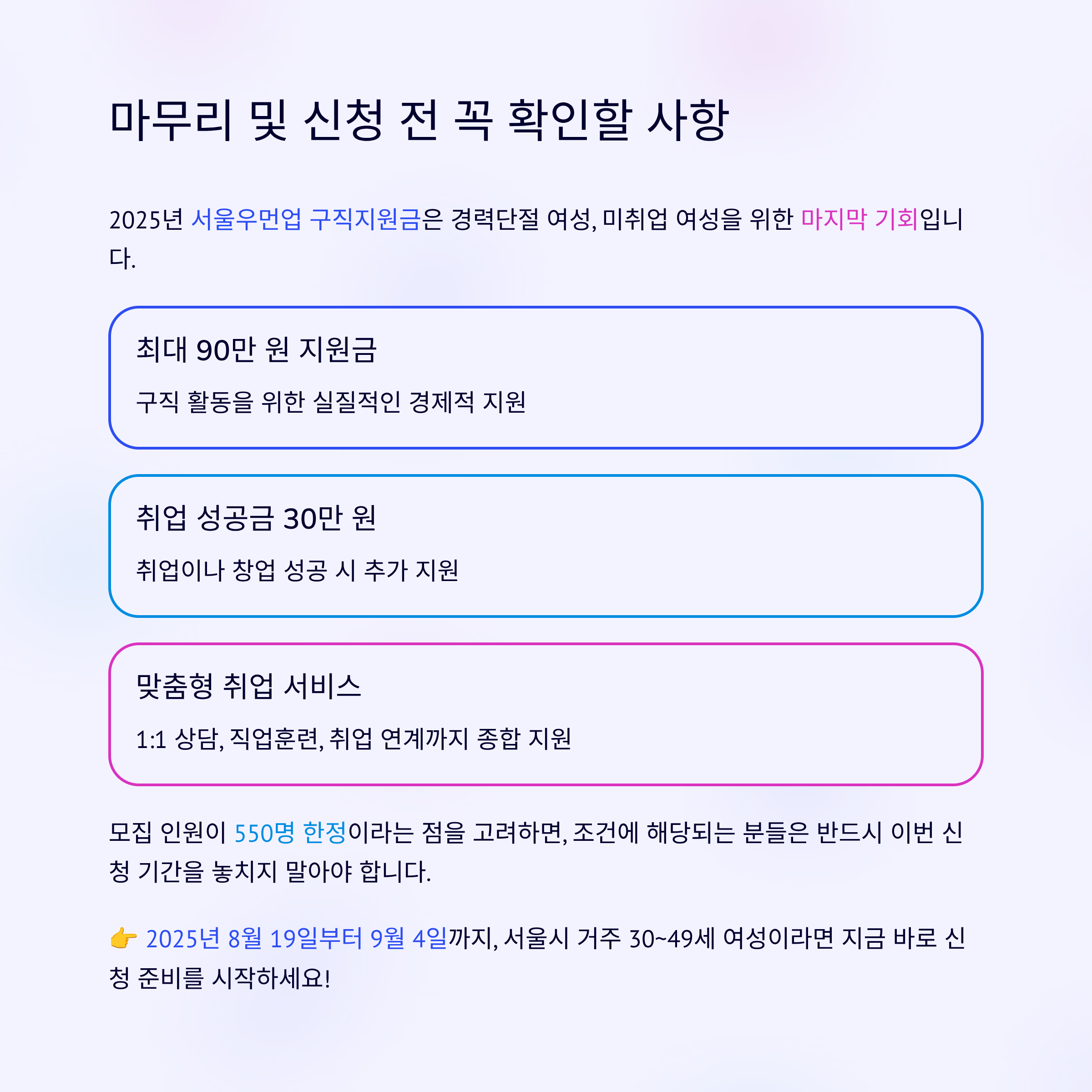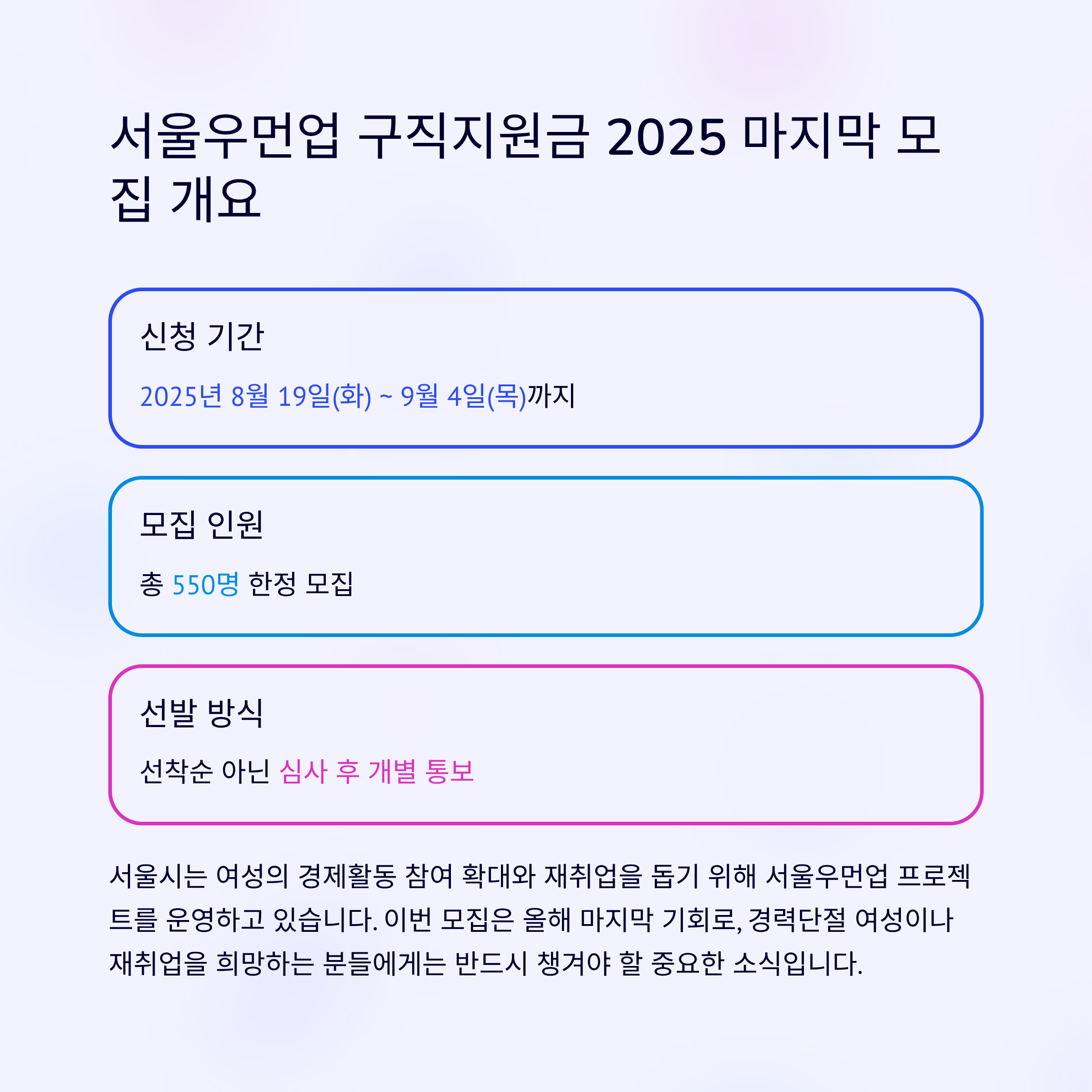 서울시는 여성의 경제활동 참여 확대와 재취업을 돕기 위해 서울우먼업 프로젝트를 운영하고 있습니다. 이번 구직지원금 신청 기간은 2025년 8월 19일(화)부터 9월 4일(목)까지이며, 총 550명을 모집합니다.