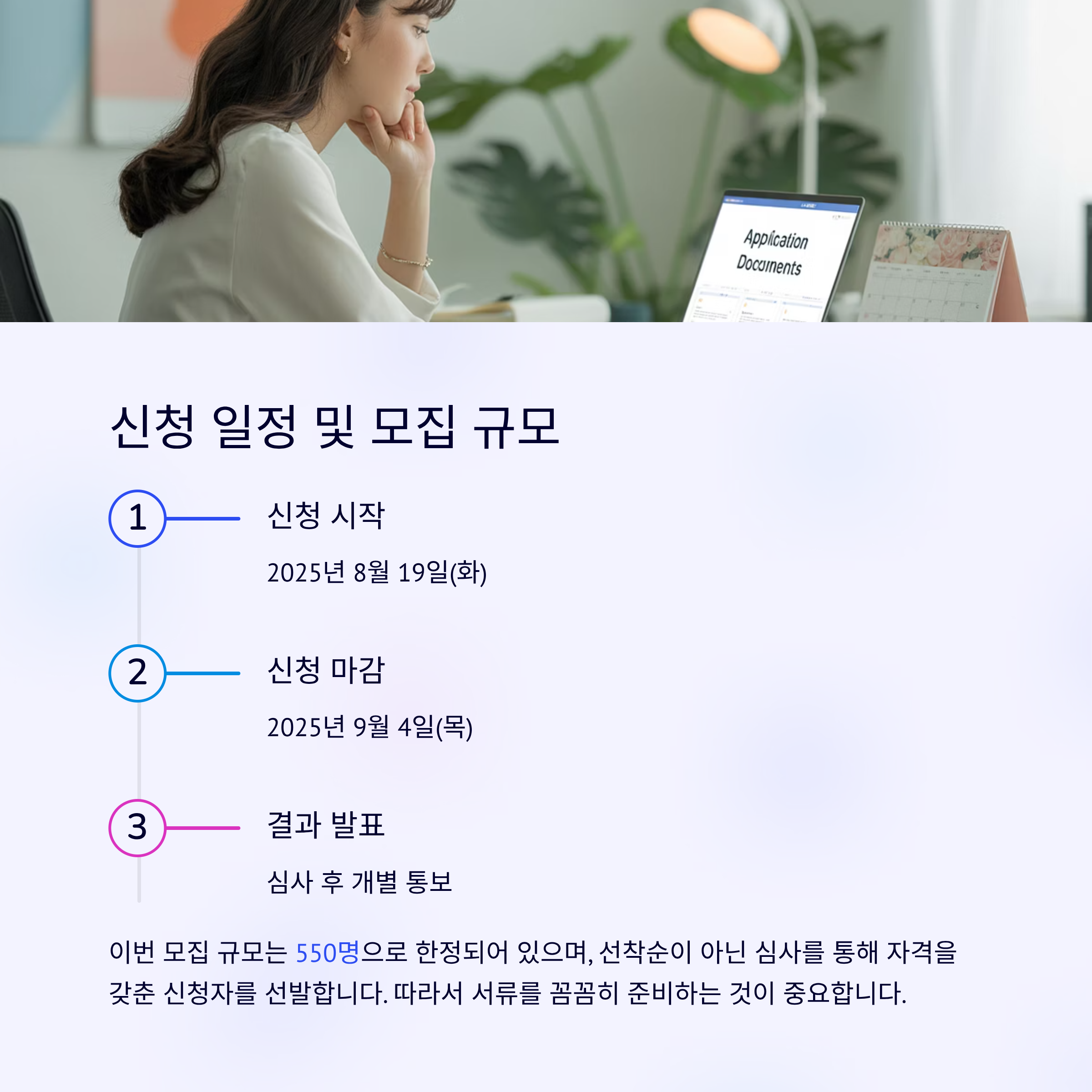 이번 모집 규모는 550명으로 한정되어 있으며, 선착순이 아닌 심사를 통해 자격을 갖춘 신청자를 선발합니다. 따라서 서류를 꼼꼼히 준비하는 것이 중요합니다.