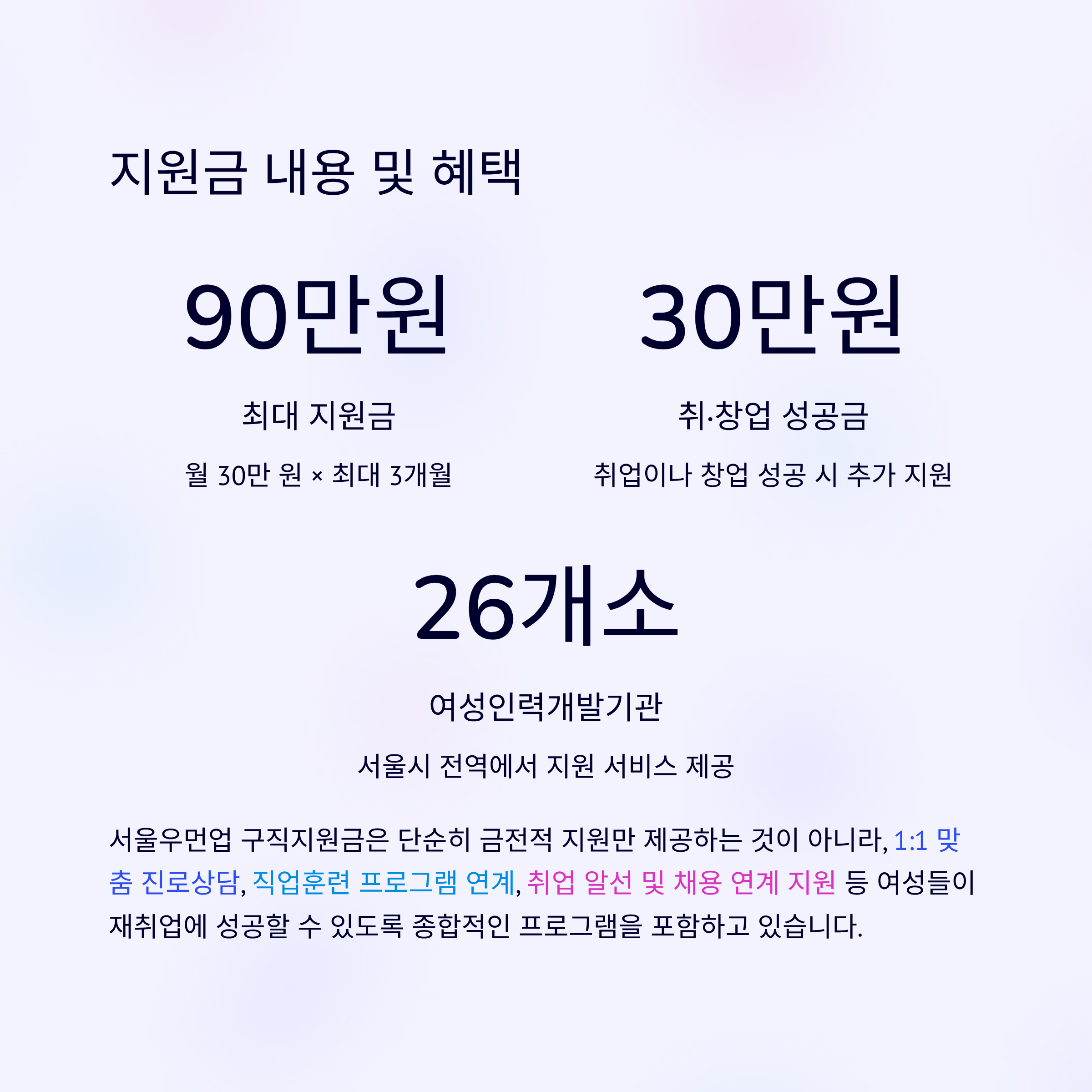 서울우먼업 구직지원금은 단순히 금전적 지원만 제공하는 것이 아니라, 여성들이 재취업에 성공할 수 있도록 종합적인 프로그램을 포함하고 있습니다.