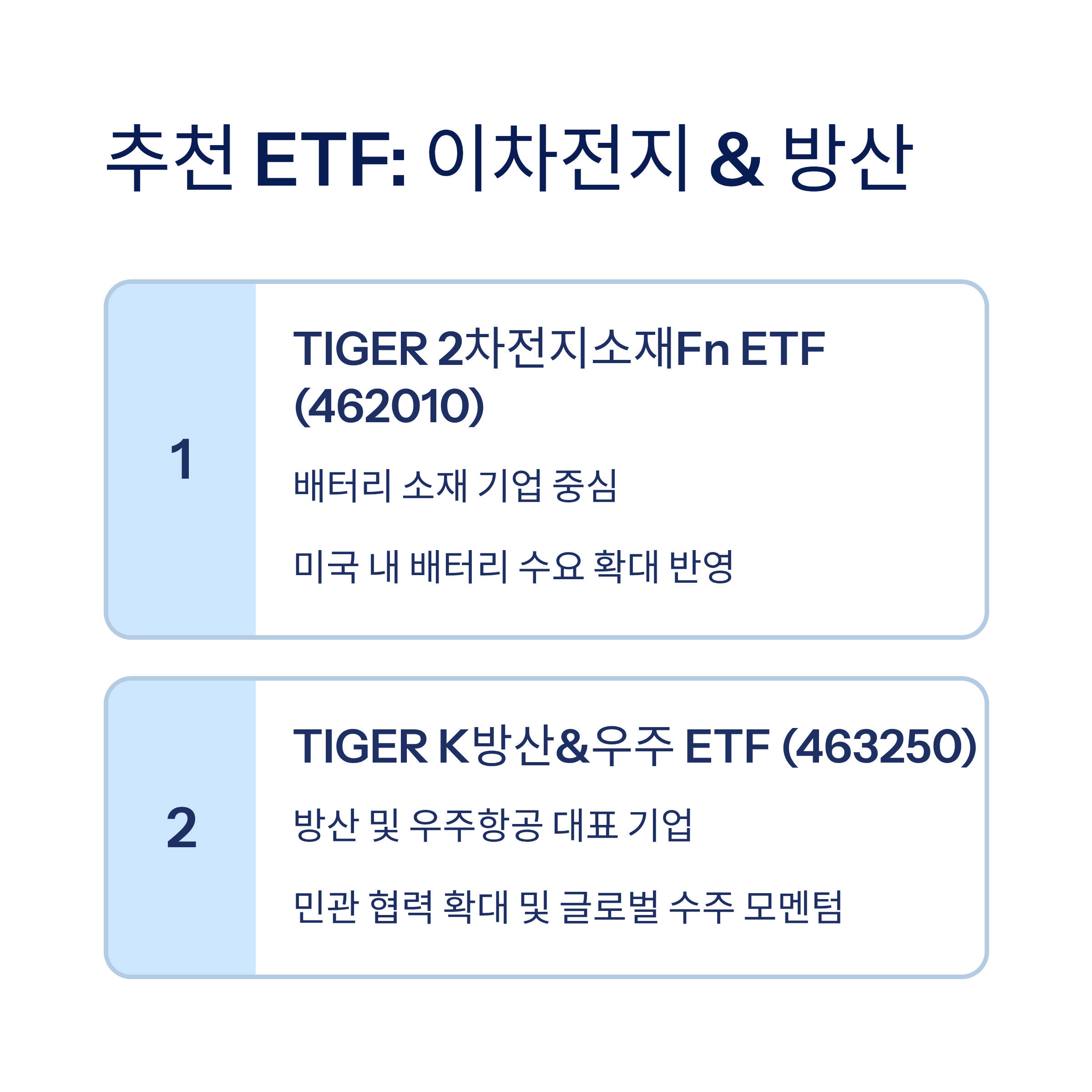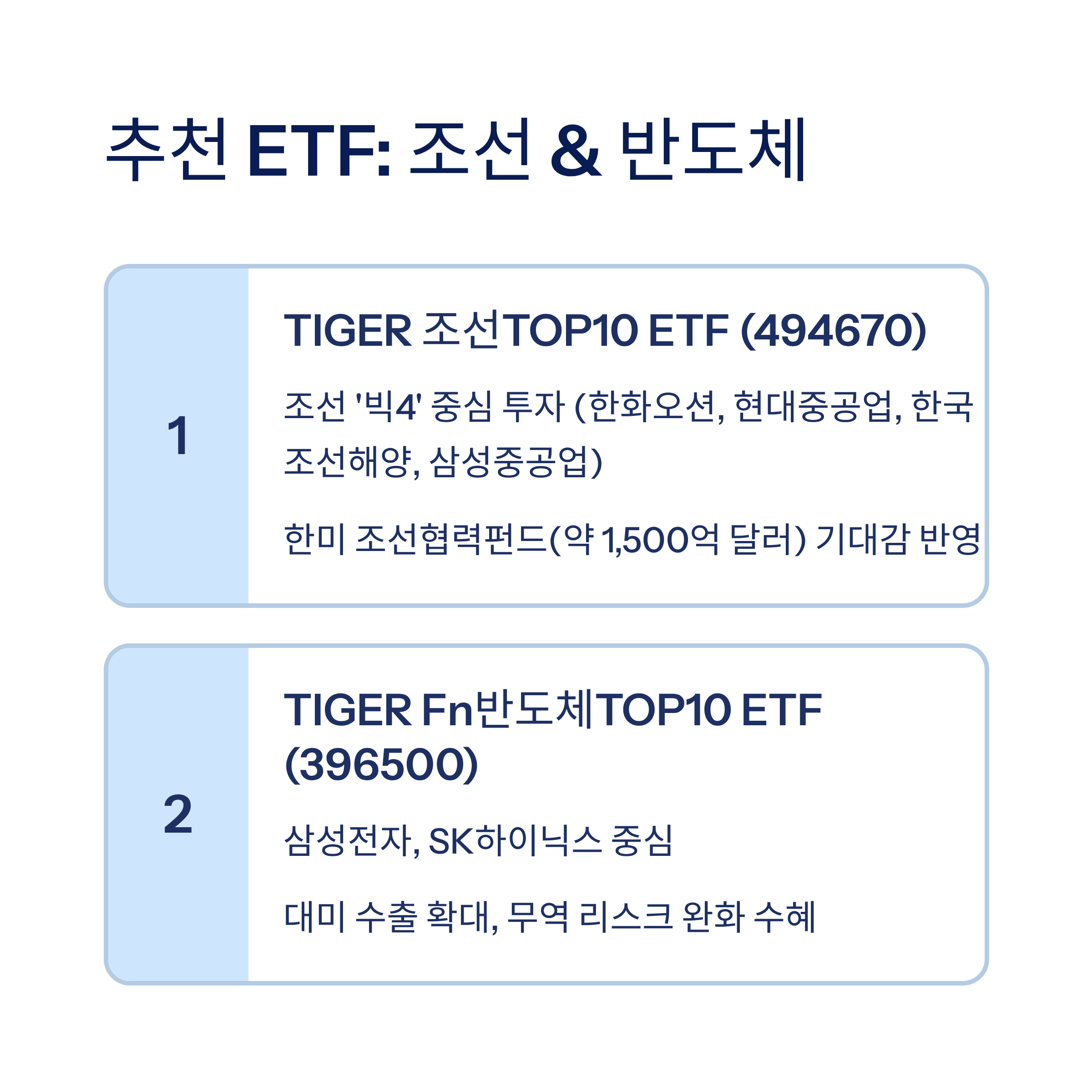 특히 조선, 반도체, 이차전지, 방산 ETF는 안정성과 성장성을 동시에 확보할 수 있는 분야이므로 포트폴리오에 적극적으로 고려해볼 만합니다.