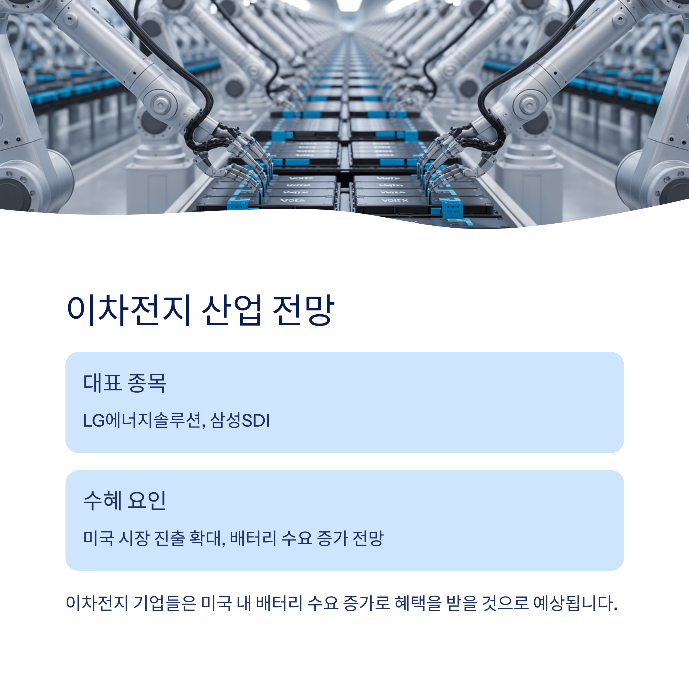 • 이차전지 대표주: LG에너지솔루션, 삼성SDI → 미국 시장 진출 확대, 배터리 수요 증가 전망