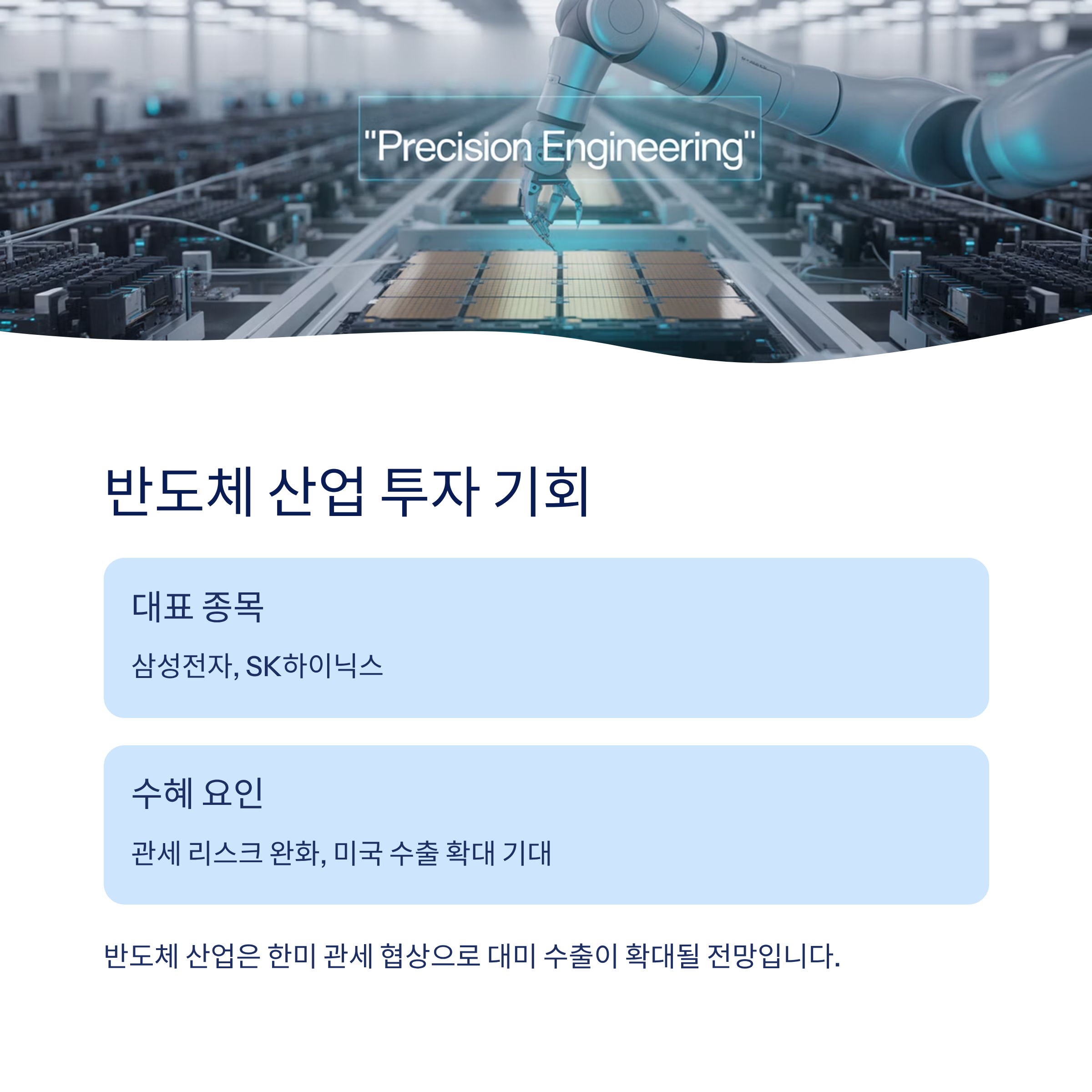 • 반도체 대표주: 삼성전자, SK하이닉스 → 관세 리스크 완화, 미국 수출 확대 기대