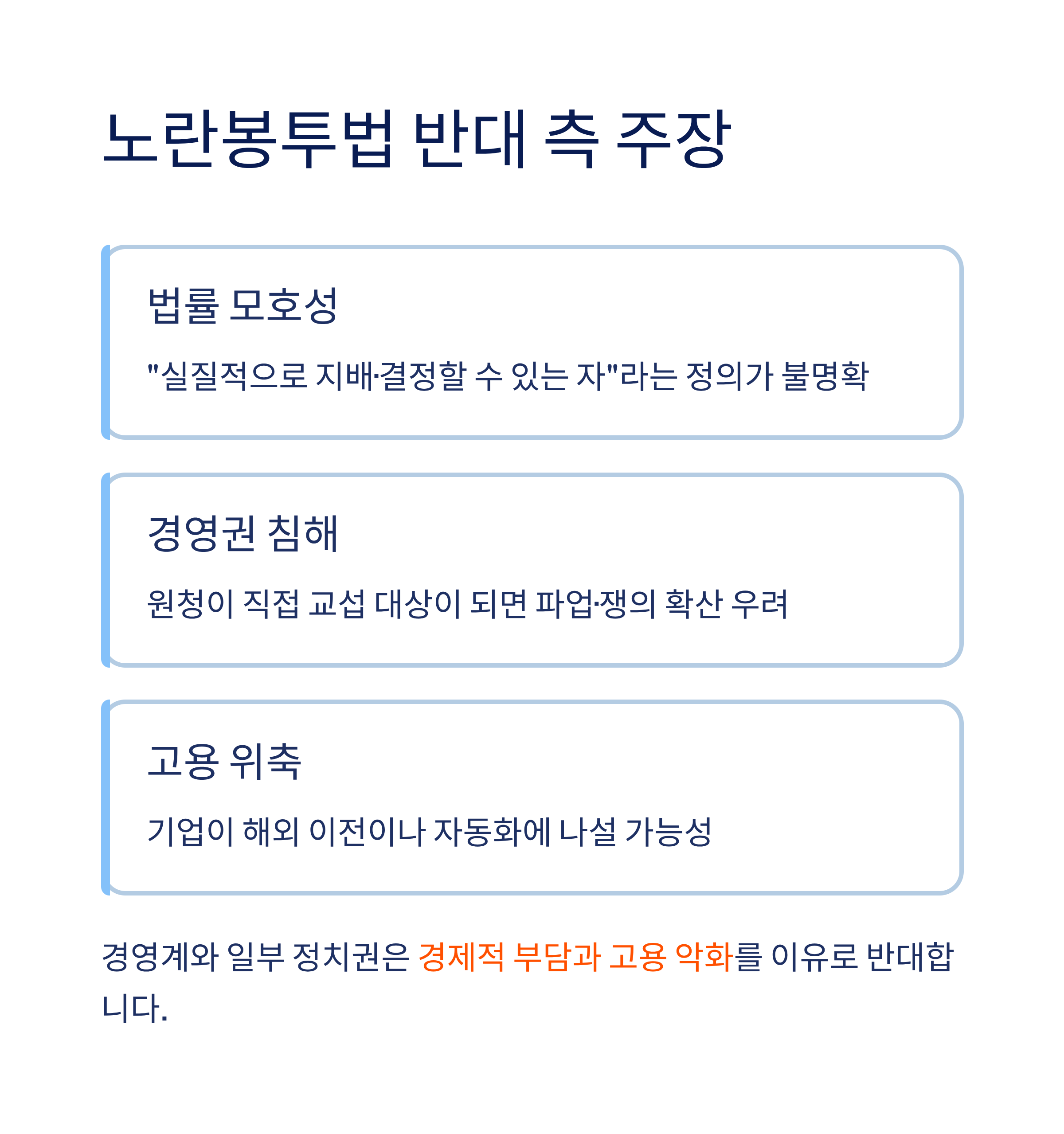 - 반대 측: 법률 모호성, 경영권 침해, 사회 갈등·고용 악화 우려