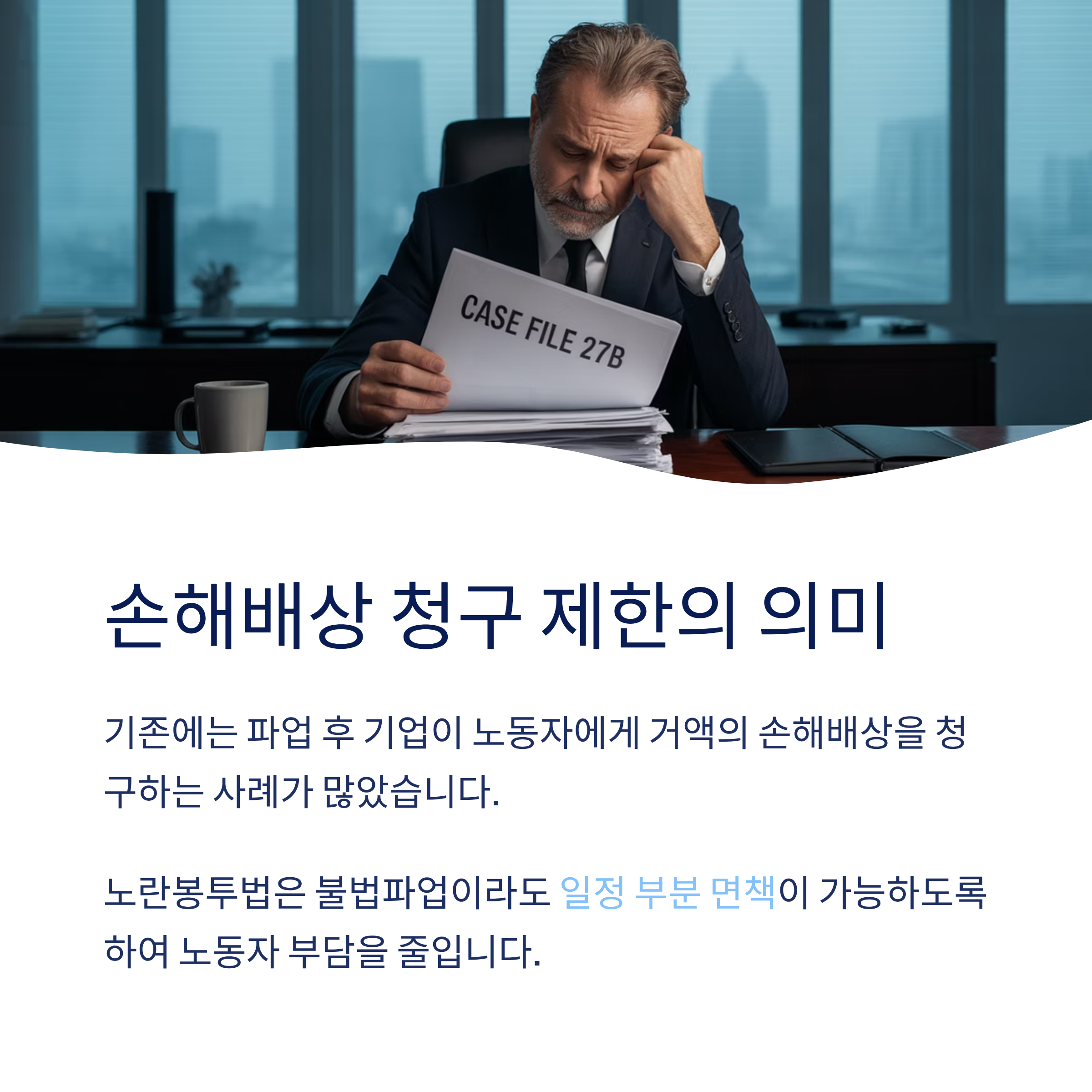- 기업이 파업 노동자에게 무분별하게 손해배상을 청구하지 못하도록 제한