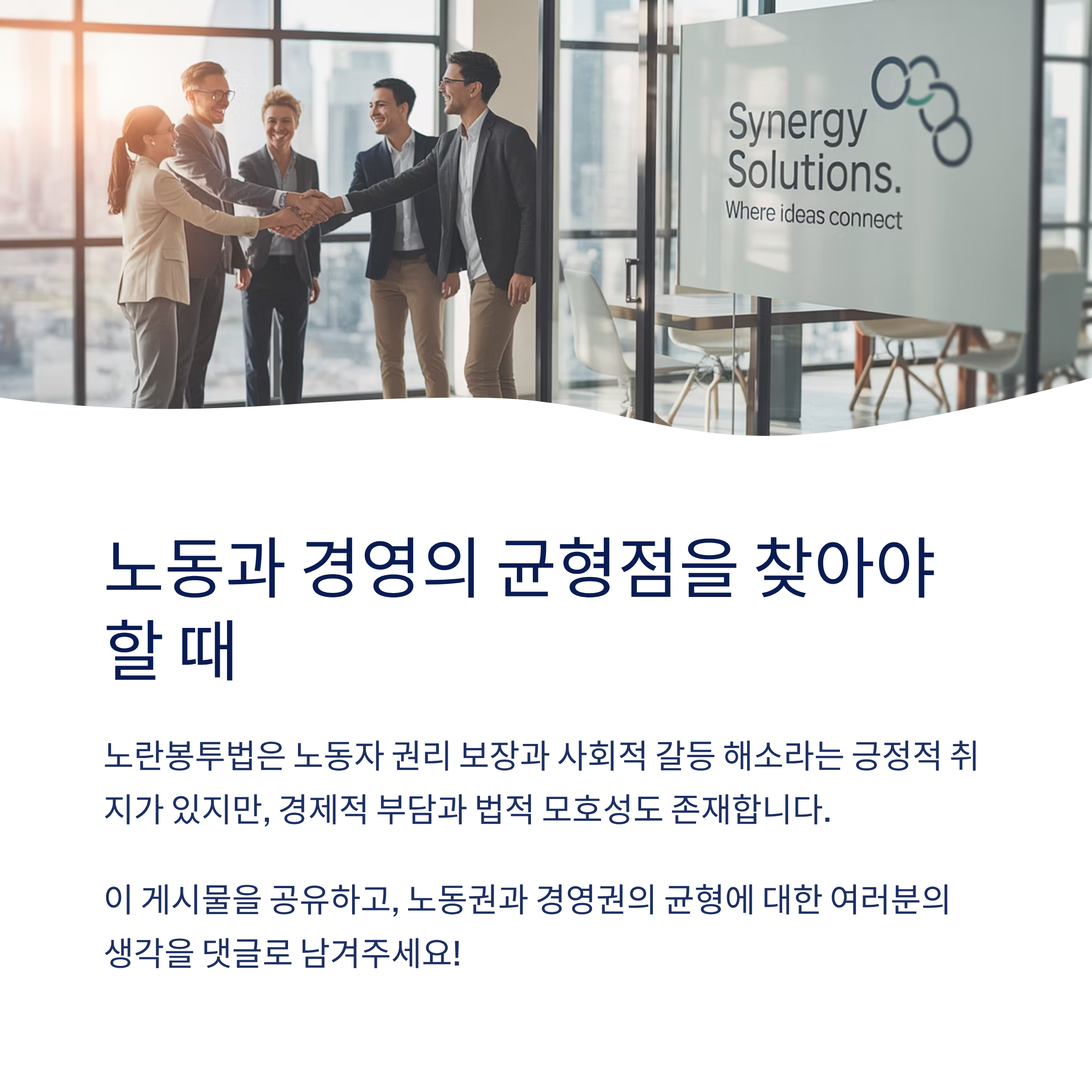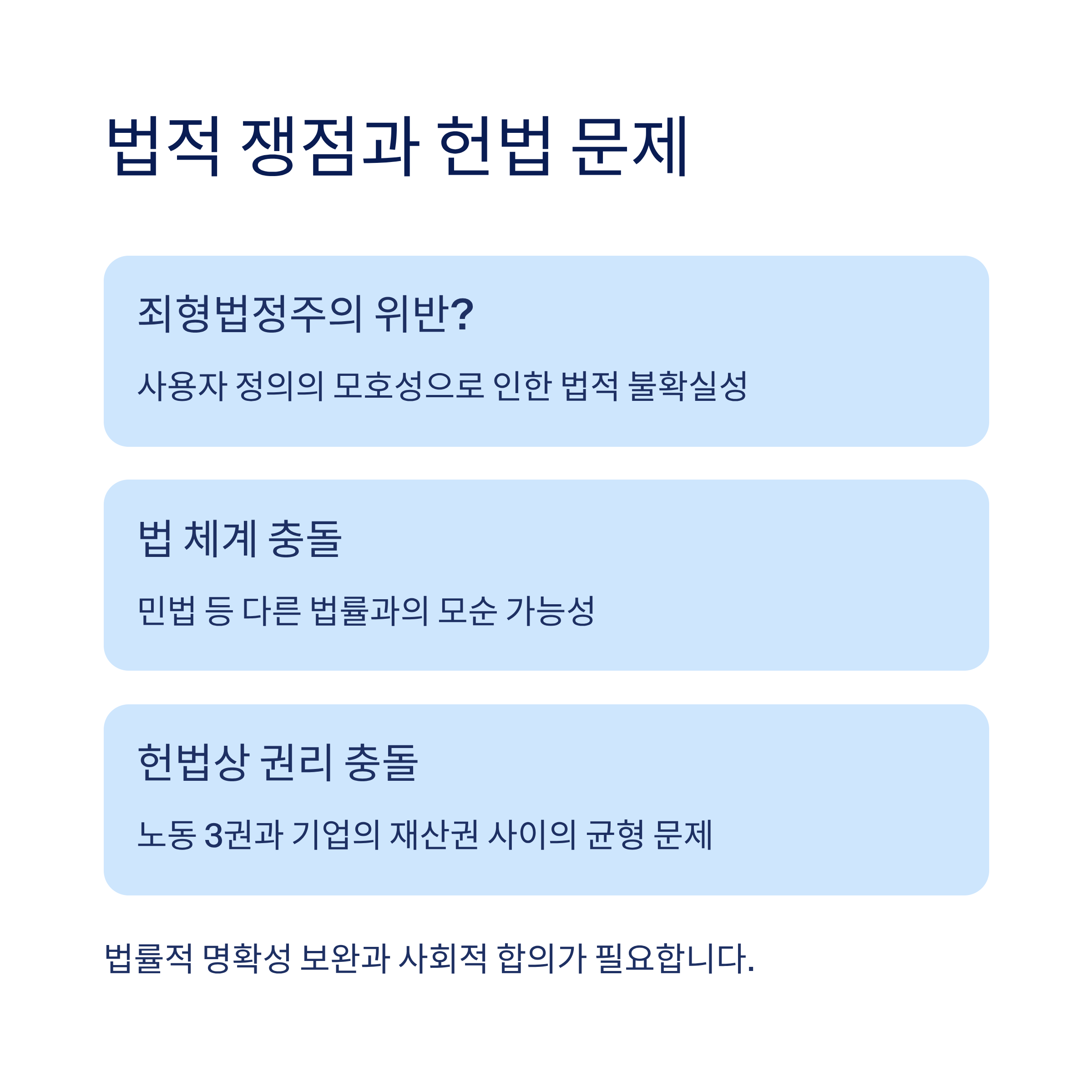 이 법은 노동자의 권리 강화를 목표로 하지만, 동시에 경영계의 반발과 법적 충돌 우려도 제기되고 있습니다.