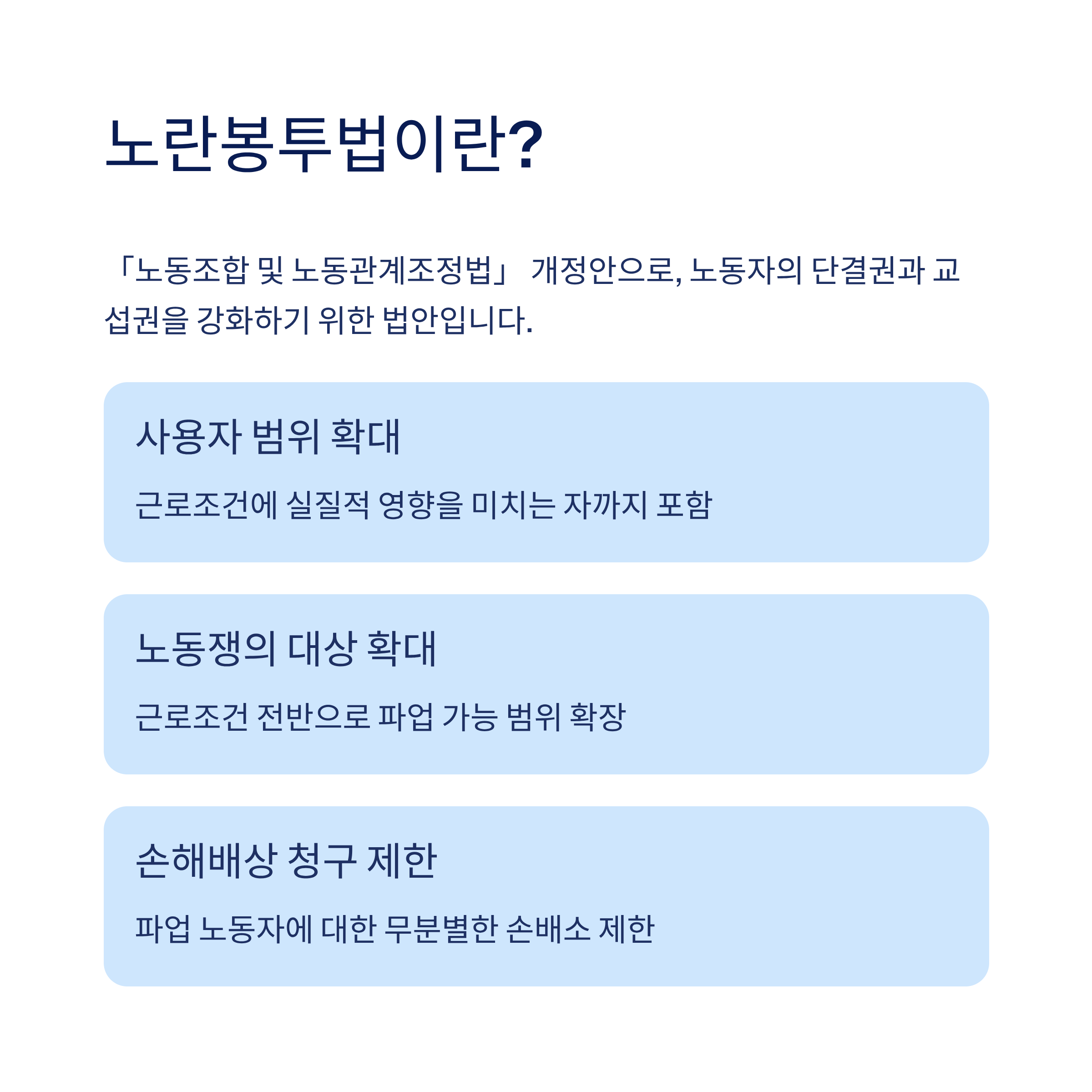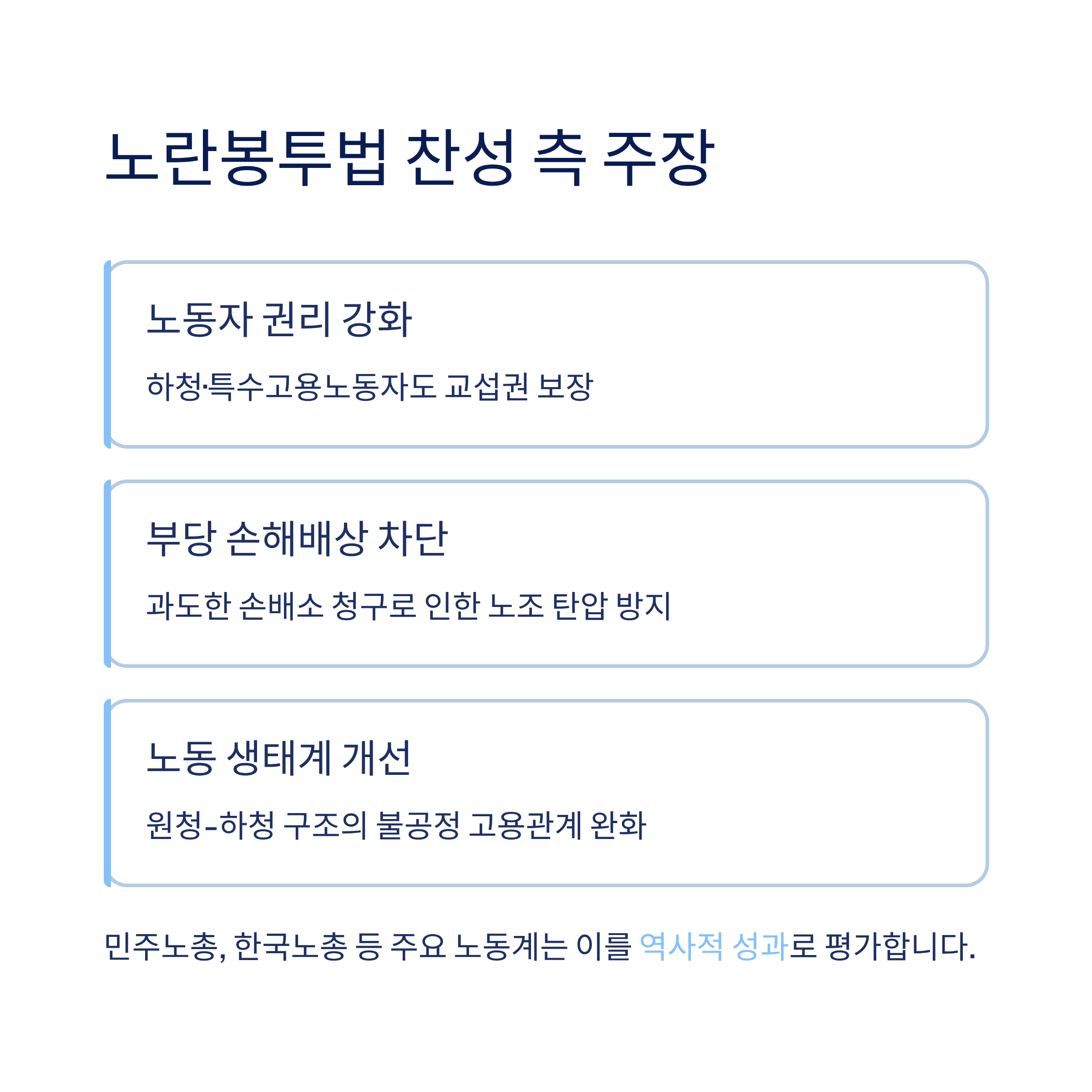 👉 요약하면, 노동자의 단결권과 교섭권 강화를 위한 법이지만, 동시에 법적·경제적 논란도 크다는 점이 특징입니다.