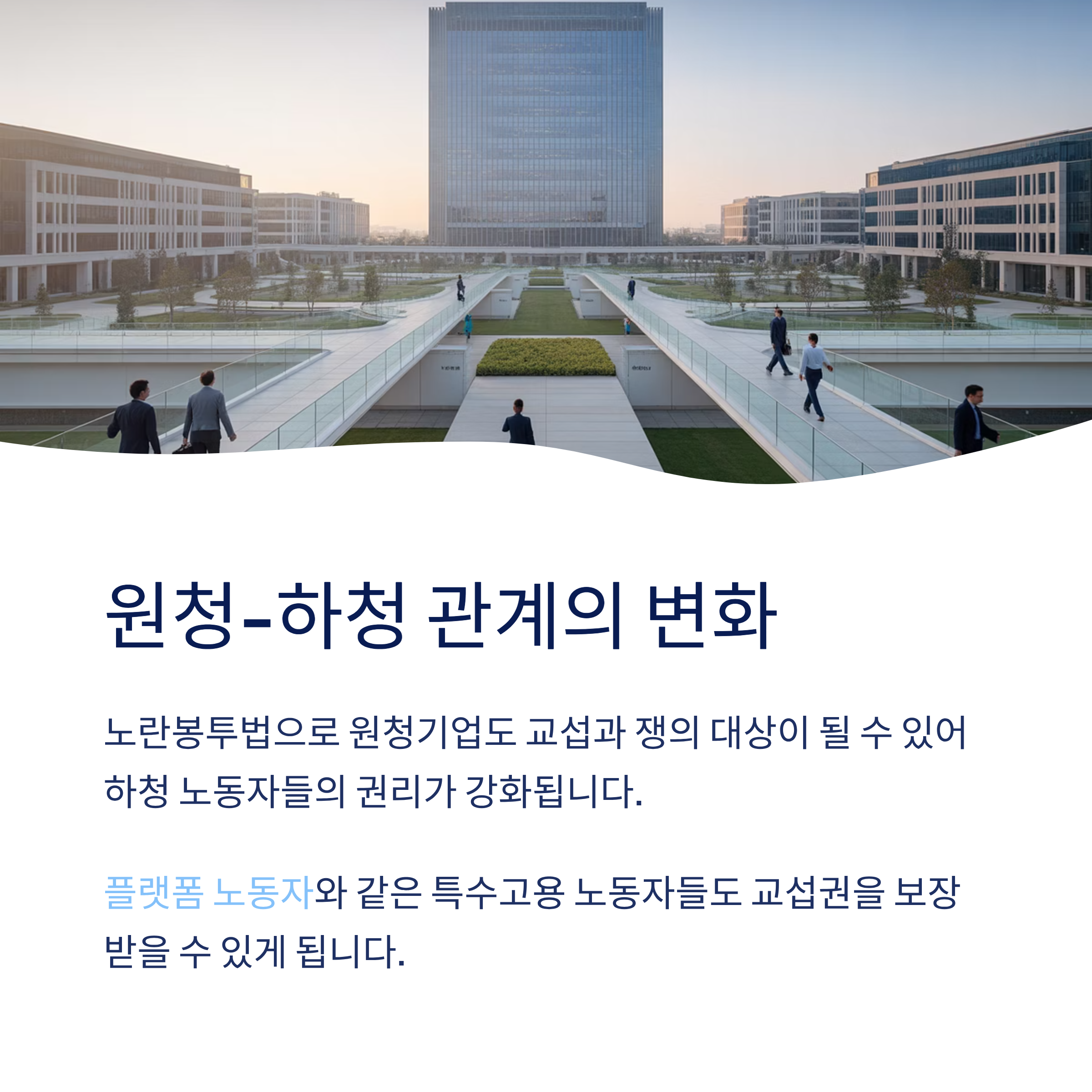 원청-하청 구조의 불공정한 고용관계를 완화하고 플랫폼 노동자 권리 보호에도 기여. - 헌법상 노동 3권 실질적 보장