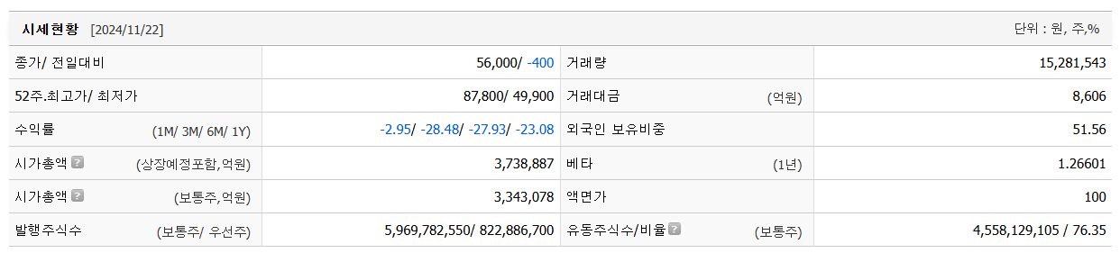 삼성전자의 현재 주가는 56,000원입니다. 전일 대비 -400원 이동한 모습입니다. 시가 총액은 345조6504억 원이며 발행 주식은 총 5,969,782,550주 입니다. 외국인이 보유한 비중은 51.56%입니다. 삼성전자 기업의 영업이익은 억 원을 달성했으며 배당 수익율은 1.84% 입니다.