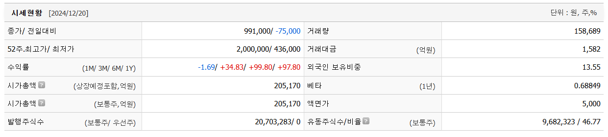 고려아연의 현재 주가는 991,000원입니다. 전일 대비 -75,000원 이동한 모습입니다. 시가 총액은 20조5170억 원이며 발행 주식은 총 20,703,283주 입니다. 외국인이 보유한 비중은 13.55%입니다. 고려아연 기업의 영업이익은 억 원을 달성했으며 배당 수익율은 3.01% 입니다.