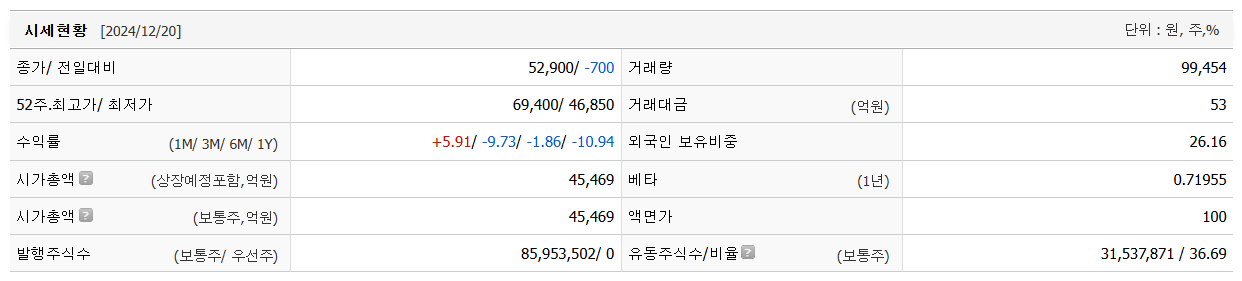 넷마블의 현재 주가는 52,900원입니다. 전일 대비 -700원 이동한 모습입니다. 시가 총액은 4조5469억 원이며 발행 주식은 총 85,953,502주 입니다. 외국인이 보유한 비중은 26.16%입니다. 넷마블 기업의 영업이익은 억 원을 달성했으며 배당 수익율은 % 입니다.