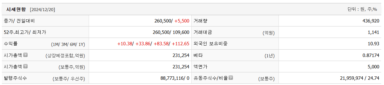 HD현대중공업의 현재 주가는 260,500원입니다. 전일 대비 원 이동한 모습입니다. 시가 총액은 23조1254억 원이며 발행 주식은 총 88,773,116주 입니다. 외국인이 보유한 비중은 10.93%입니다. HD현대중공업 기업의 영업이익은 억 원을 달성했으며 배당 수익율은 % 입니다.