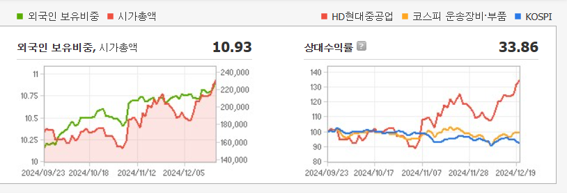 만약 단기 포트폴리오를 구성한다면 시가 총액과 장중 거래량도 체크해야 합니다. HD현대중공업의 시가 총액은 23조1254억 원이며 장중 거래량은 436,920원 을 기록했습니다. 대주주의 정보는 크게 중요하지 않지만 장기적인 관점에서는 확인해보는 것이 좋겠습니다.