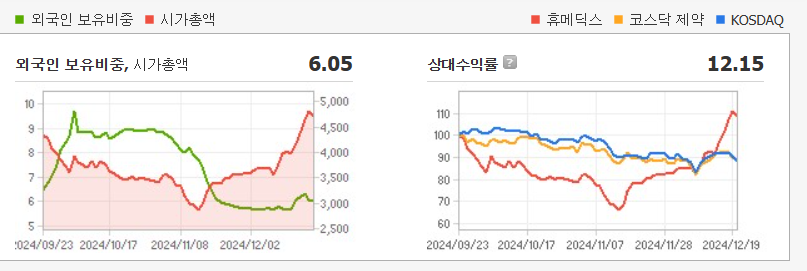 단기 포트폴리오를 구성한다면 시가 총액과 장중 거래량도 꼭 살펴봐야 합니다. 휴메딕스의 시가 총액은 4717억 원이며 장중 거래량은 314,682원 을 기록했습니다. 대주주의 정보는 크게 중요하지 않을 수도 있으나 장기적으로는 확인해보는 것이 좋겠습니다.