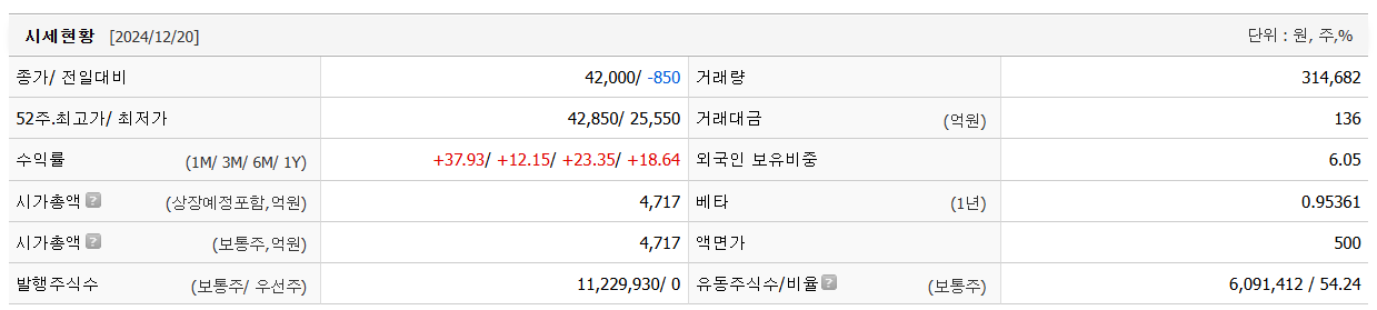 단기 포트폴리오를 구성한다면 시가 총액과 장중 거래량도 꼭 살펴봐야 합니다. 휴메딕스의 시가 총액은 4717억 원이며 장중 거래량은 314,682원 을 기록했습니다. 대주주의 정보는 크게 중요하지 않을 수도 있으나 장기적으로는 확인해보는 것이 좋겠습니다.