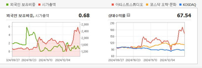 단기 포트폴리오를 구성한다면 시가 총액과 장중 거래량도 살펴봐야 합니다. 아티스트스튜디오의 시가 총액은 2244억 원이며 장중 거래량은 2,175,817원 을 기록했습니다. 대주주의 정보는 중요하지 않을 수 있으나 장기적으로는 확인이 필요합니다.