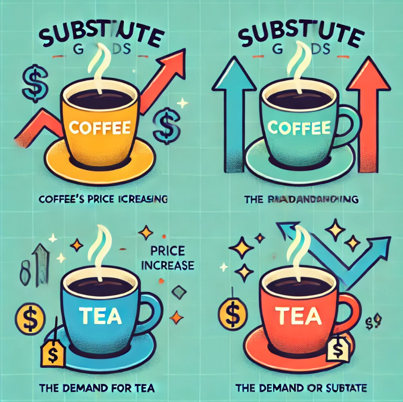 커피와 차: 커피 가격이 상승하면 소비자들은 대체재인 차를 더 많이 소비하려 할 수 있습니다.