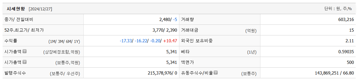 티웨이항공의 현재 주가는 2,480원입니다. 전일 대비 -5원 이동한 모습입니다. 시가 총액은 5169억 원이며 발행 주식은 총 215,378,976주 입니다. 외국인이 보유한 비중은 2.11%입니다. 티웨이항공 기업의 영업이익은 억 원을 달성했으며 배당 수익율은 0.80% 입니다.